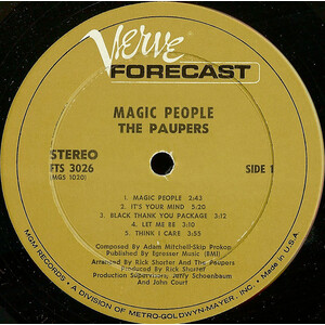 Grossman renegotiated the deal with MGM and in April The Paupers returned to New York to cut their debut album with producer Rick Shorter. Straddling period psychedelia, acid folk-rock and breezy pop, Magic People brims full of sunny melodies and kaleidoscopic rhythms. Kicking off with the infectious drum-driven title track, the album’s high points include the Byrdsian folk-rocker “You and Me”, the haunting “Tudor Impressions” with its sparkling acoustic guitars and dense harmonies and the angst-ridden “Think I Care”, generally considered to be The Paupers’ definitive song.