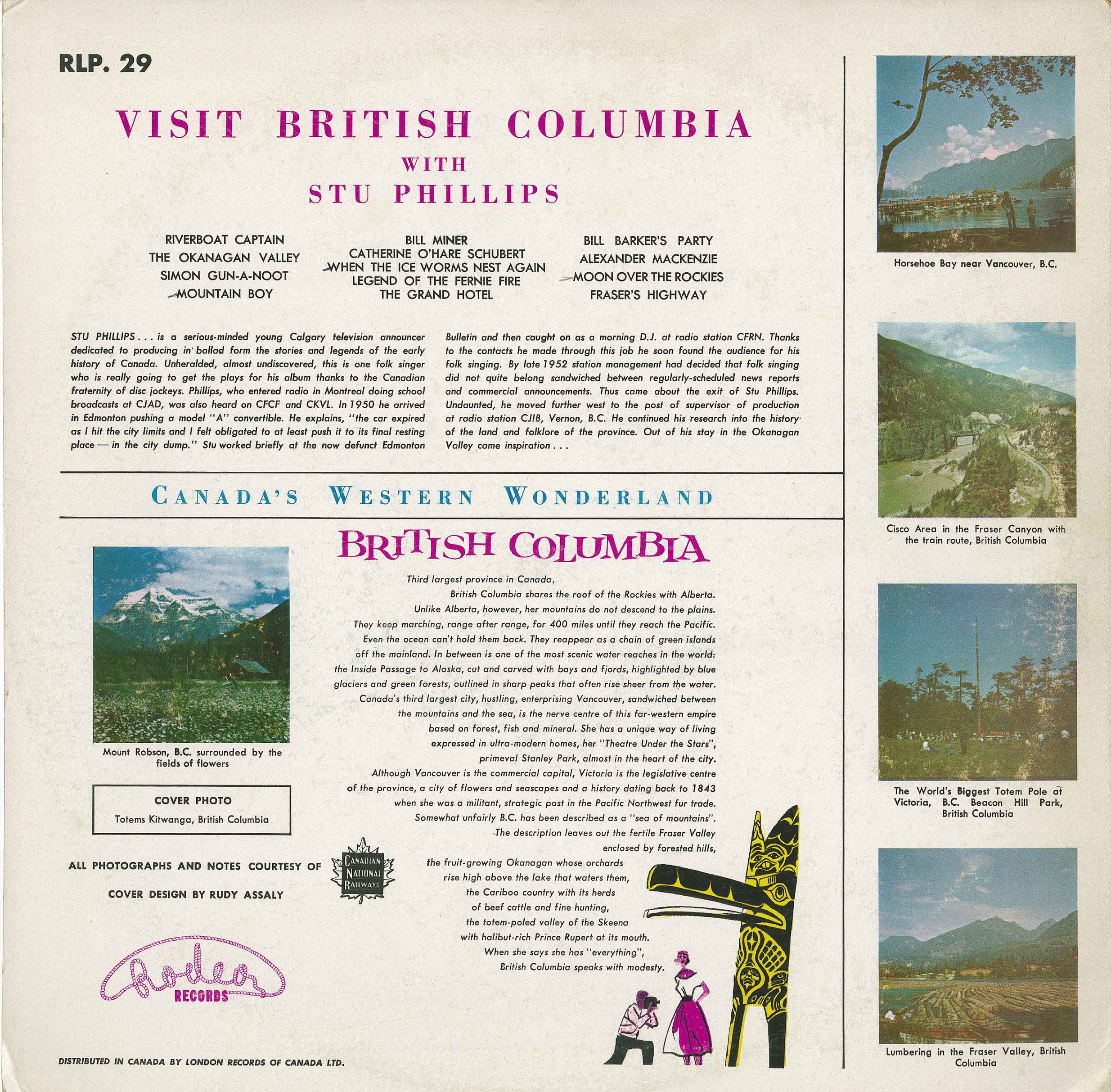 He relocated west to CJIB in Vernon, B.C., where he became supervisor of production and continued his research into regional history. Many of the songs on this album — especially those centered on the Okanagan Valley — were inspired by this time.