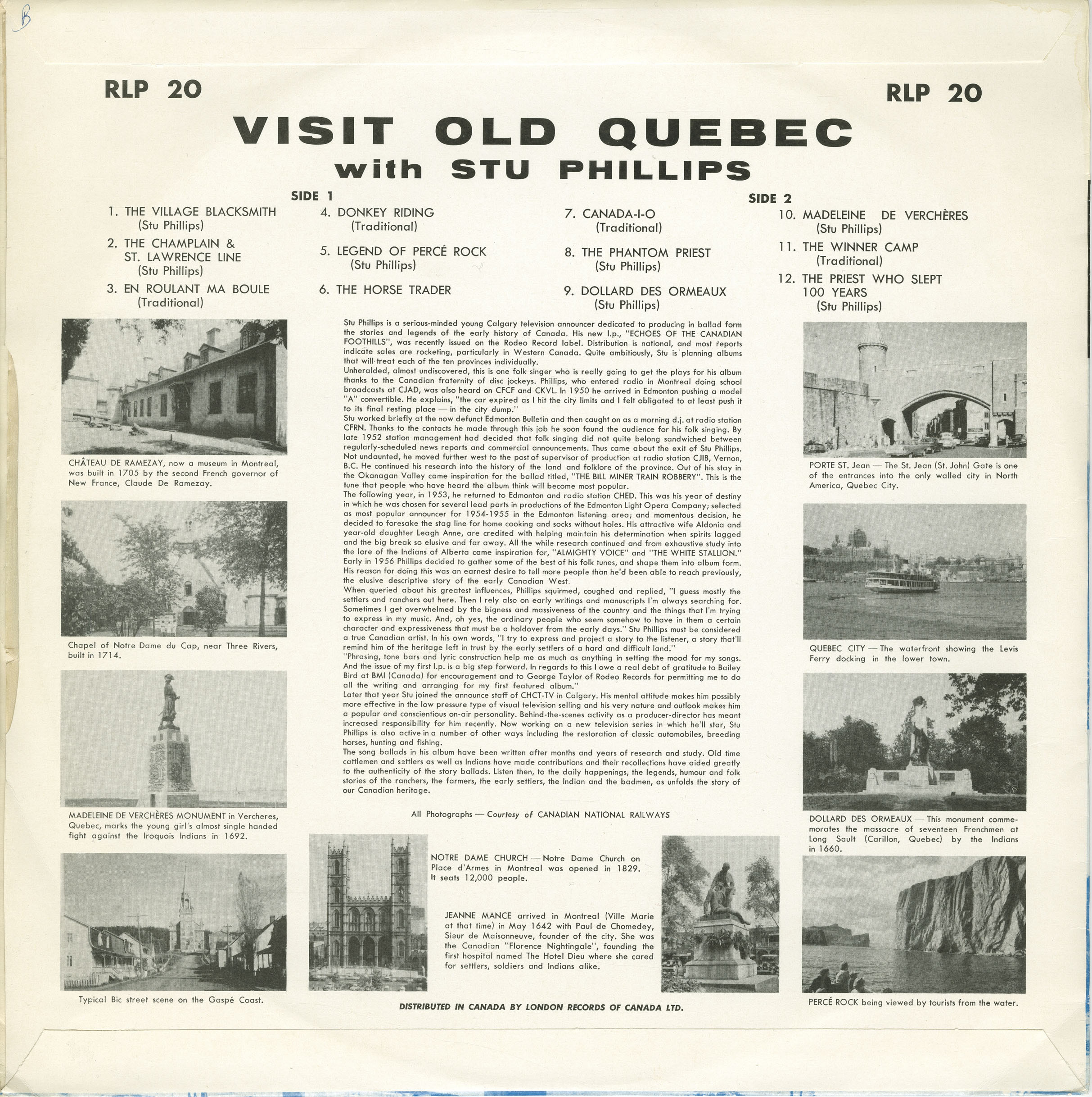 A talented songwriter with a passion for national folklore, Phillips released a series of historically themed LPs in 1957, including Echoes of the Canadian Foothills (Rodeo RLP 17), Visit Old Québec (Rodeo RLP 20), and A Visit to British Columbia (Rodeo RLP 29) which blended original ballads with traditional tunes celebrating early Canadian settlers, Indigenous stories, and legendary landmarks. His lyrical storytelling and gentle delivery became a signature style, setting him apart from Nashville contemporaries.