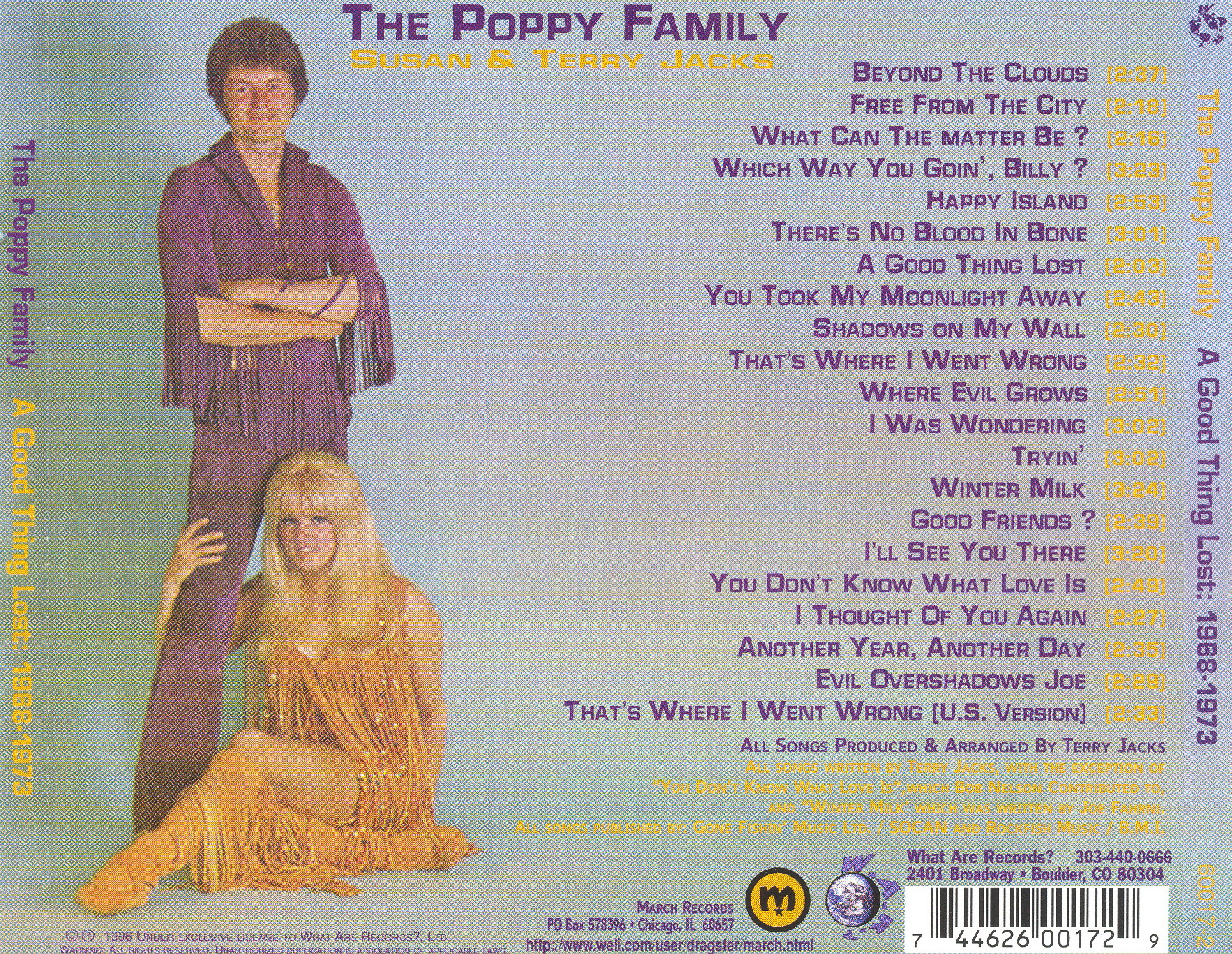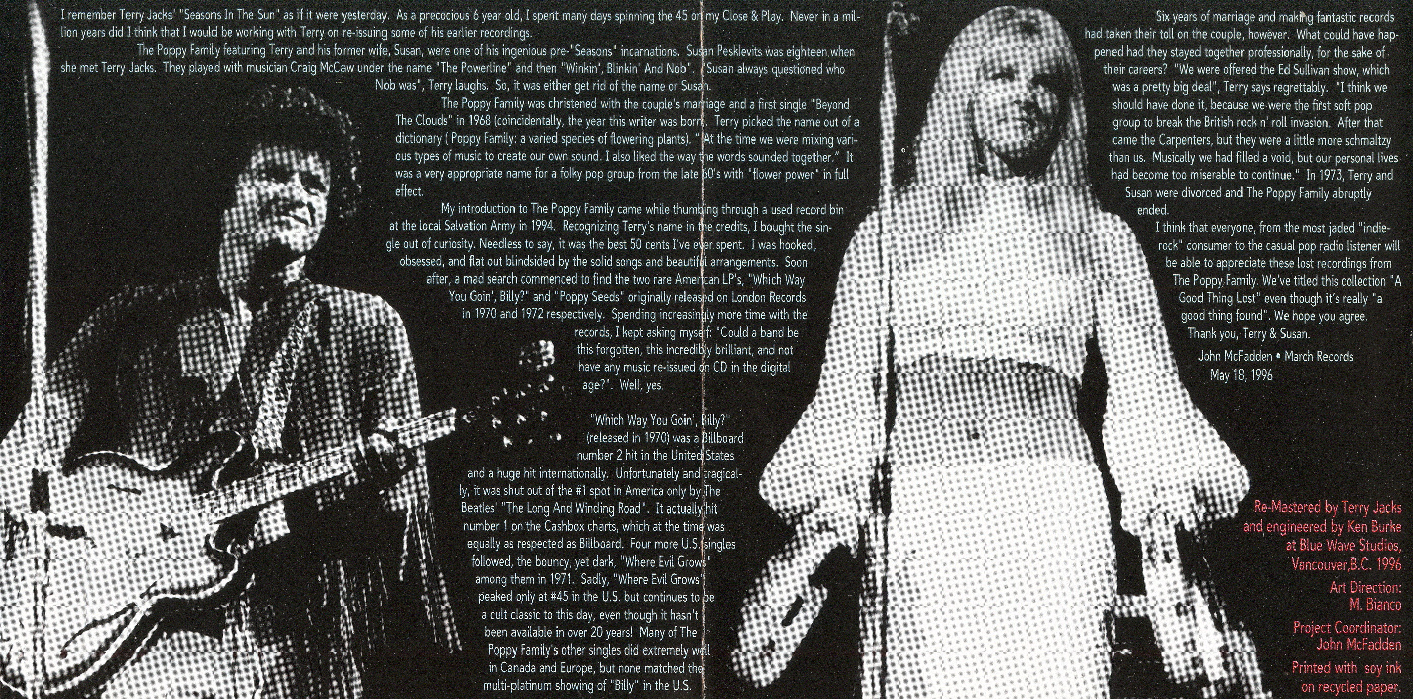 I think that everyone, from the most jaded “indie-rock” consumer to the casual pop radio listener will be able to appreciate these lost recordings from The Poppy Family. We’ve titled this collection “A Good Thing Lost” even though it’s really “a good thing found.” We hope you agree. Thank you, Terry & Susan.