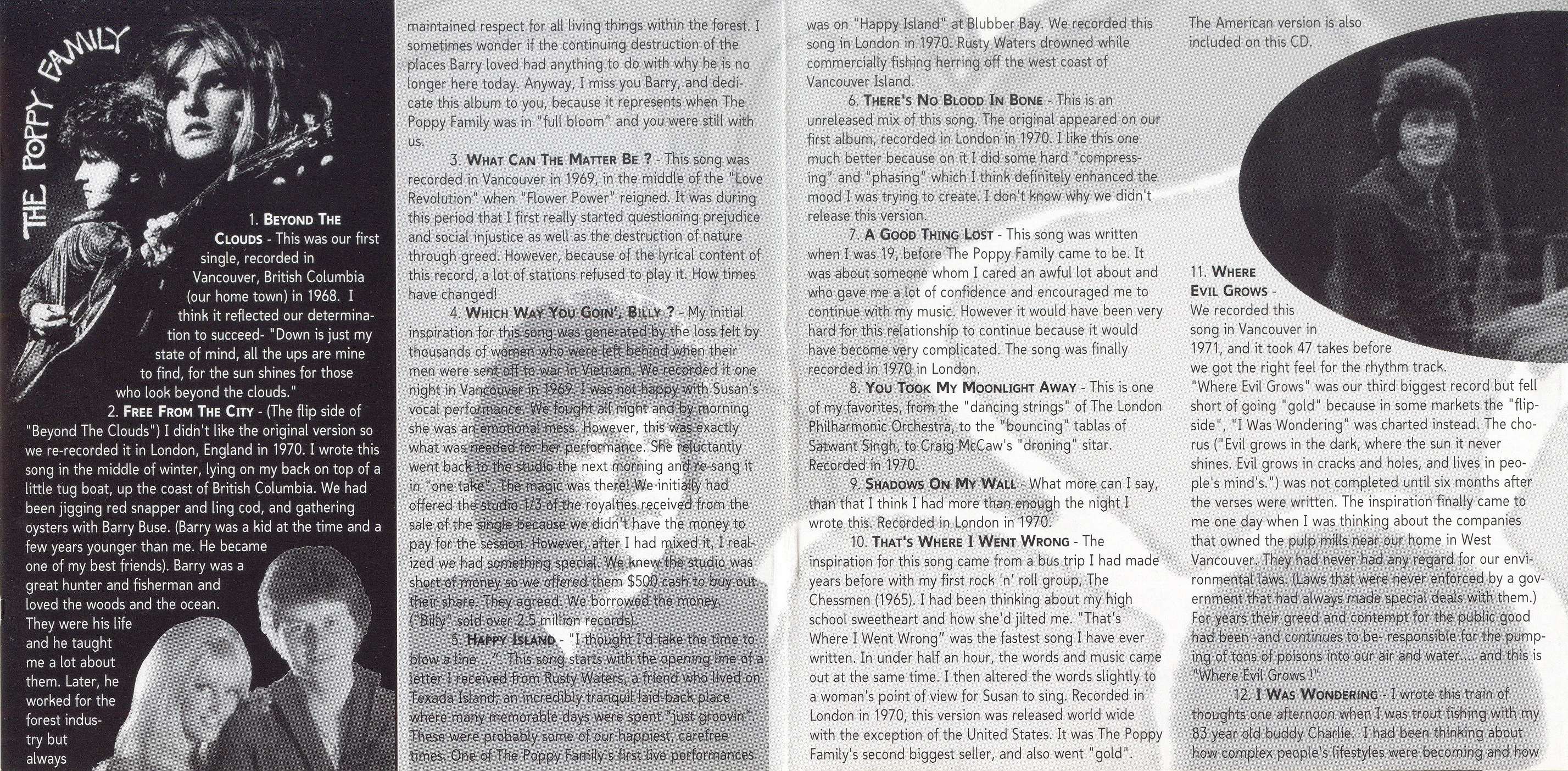FREE FROM THE CITY – (The flip side of “Beyond The Clouds”) I didn’t like the original version so we re-recorded it in London, England in 1970. I wrote this song in the middle of winter, lying on my back on top of a little tug boat, up the coast of British Columbia. We had been jigging red snapper and ling cod, and gathering oysters with Barry Buse. (Barry was a kid at the time and a few years younger than me. He became one of my best friends). Barry was a great hunter and fisherman and loved the woods and the ocean. They were his life and he taught me a lot about them. Later, he worked for the forest industry and always maintained respect for all living things within the forest. I sometimes wonder if the continuing destruction of the places Barry loved had anything to do with why he is no longer here today. Anyway, I miss you Barry, and dedicate this album to you, because it represents when The Poppy Family was in “full bloom” and you were still with us.