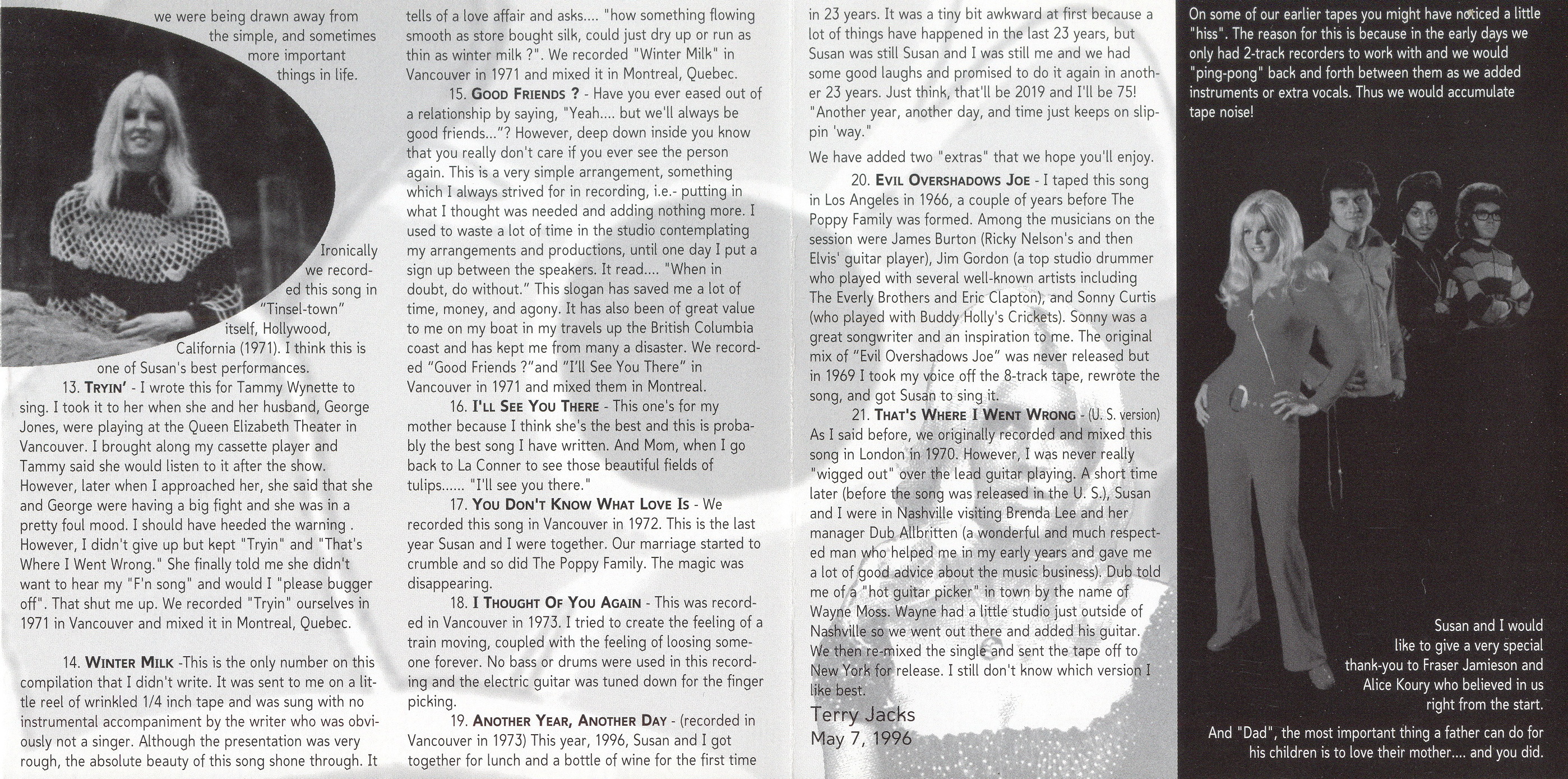 THAT’S WHERE I WENT WRONG – The inspiration for this song came from a bus trip I had made years before with my first rock ’n’ roll group, The Chessmen (1965). I had been thinking about my high school sweetheart and how she’d jilted me. “That’s Where I Went Wrong” was the fastest song I have ever written. In under half an hour, the words and music came out at the same time. The song’s words change slightly to a woman’s point of view for Susan to sing. Recorded in London in 1970, this version was released world wide and a new version for the United States was The Poppy Family’s second biggest seller, and also went “gold”.