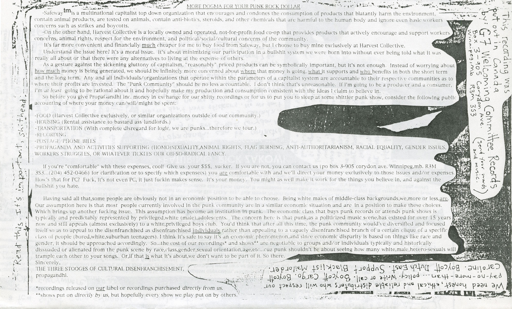 I Spy’s half of the split erupts like a Molotov cocktail — messy, emotional, and unmistakably urgent. Where Propagandhi’s songs are tightly structured and sardonic, I Spy offers pure chaotic energy laced with vulnerability. Tracks like “Remain,” “Just Between Friends,” and “Sixty Billion Served” tackle everything from toxic masculinity and emotional repression to class war and fast food imperialism. The lyrics — often scrawled like zine poetry in the album insert — hit hard with no filter, but also show a level of introspection rare in hardcore punk.