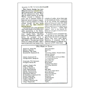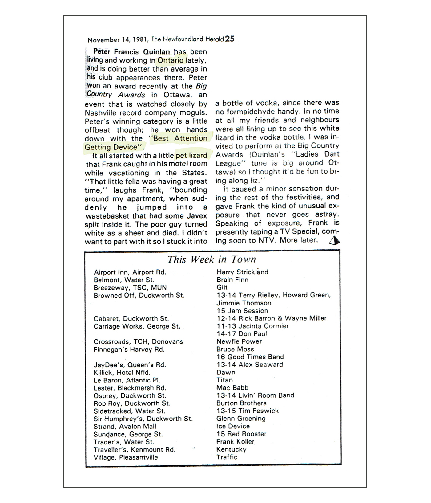 Peter Francis Quinlan released this terrific Newfoundland recording of folk rock synth with the help of THE who's who of Newfoundland recording artists of the day, not to mention the more than 200 other folks who likely contributed, as listed on the back of the album. Shock Absorber was released on what could be the-most-Newfoundland of Production companies - Cod Oil Productions. 8 of the 10 compositions were written by Peter Francis Quinlan. His best known song "The Night the Ladies Dart League Had the Fight", was a comedy ballad about The Bull's-Eyes and Debbies hucking darts at eachother down at Lucky's Place - the youtube video has more than 6,000 views. The song "Newfoundland" is the most psychedelic song ever written about the Rock. "Shock Absorber" is a Newfie synth rocker definitely worth the price of admission. Black Gold sounds as if it was written just the other day (except oil was at $12/bbl, gold went up from $160 to a whopping $200, and the Canadian dollar dropped from 94 cents to 86 cents against it's US$ counterpart). He returned in 1997 with his only other effort, Take Me Back to Newfoundland. Later on, he was co-executive producer for the "Singers For Fishermen" CD.