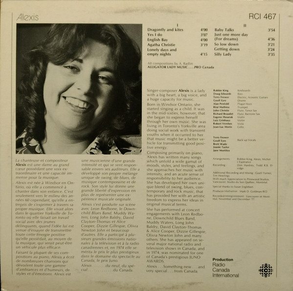 By the early 1970s Radlin had relocated to Vancouver and established herself as a performer with a versatile repertoire that blended blues, swing, contemporary folk, and rock. She shared stages with artists as varied as Leon Redbone, the Downchild Blues Band, Muddy Waters, Long John Baldry, David Clayton-Thomas, Alice Cooper, Dizzy Gillespie, and Olivia Newton-John. In 1974 she released her first LP, Alexis, on Mushroom Records, with session support that included keyboardist Robbie King and even a brief stint from guitarist Jerry Doucette. The record earned her a nomination at the Juno Awards, Canada’s highest music honour, marking a career highlight and national recognition of her songwriting.