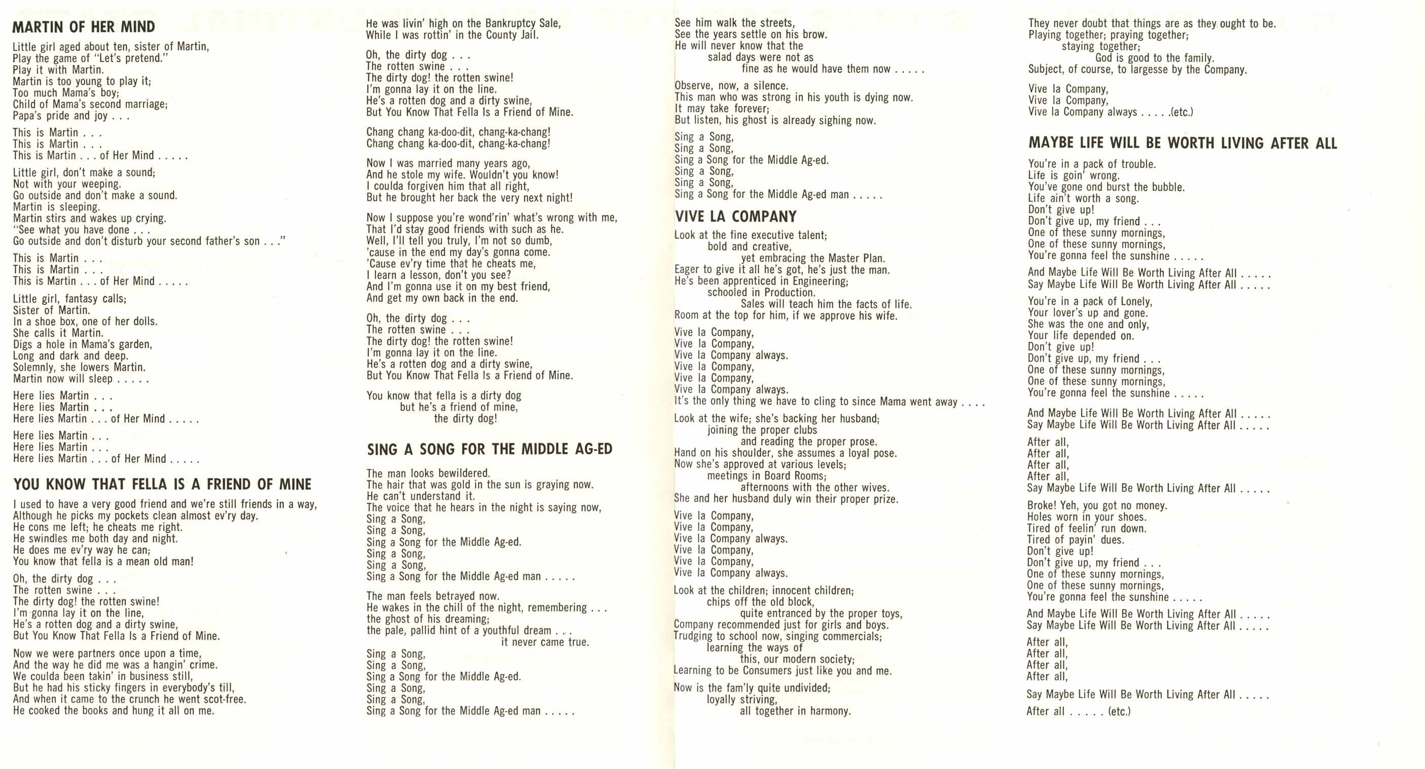 And he wrote orchestrations that are a joy to envy. He’s amazing. There are those who think that this is a somewhat dark album. I think it’s a life in a sardonic gallacity of word and yet drippings of an beautiful piece of work. It is full of compassion, and above all honesty.