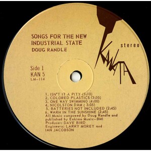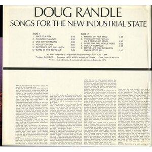 By 1970 Randle was ready to undertake his most ambitious project. Recorded at the CBC with producer Dave Bird and a band drawn from Toronto’s finest session players (Moe Koffman, Rob McConnell, Guido Basso, Peter Appleyard), Songs for the New Industrial State was issued in 1971 in a limited pressing of 500 copies on the short-lived Kanata label. Sung by Tommy Ambrose and Laurie Bower, the album merged sunshine pop, baroque orchestration, and biting social commentary. Randle’s lyrics dissected corporate greed, advertising phoniness, environmental decay, and the unease of middle age with startling candor, turning the language of jingles and commercial persuasion inside out. Songs such as Colored Plastics and Vive La Company lampooned consumer culture, while Nicolston Dam and One Way Swimming meditated on nature and escape. The album closed on a rare note of optimism with Life Will Be Worth Living After All.
