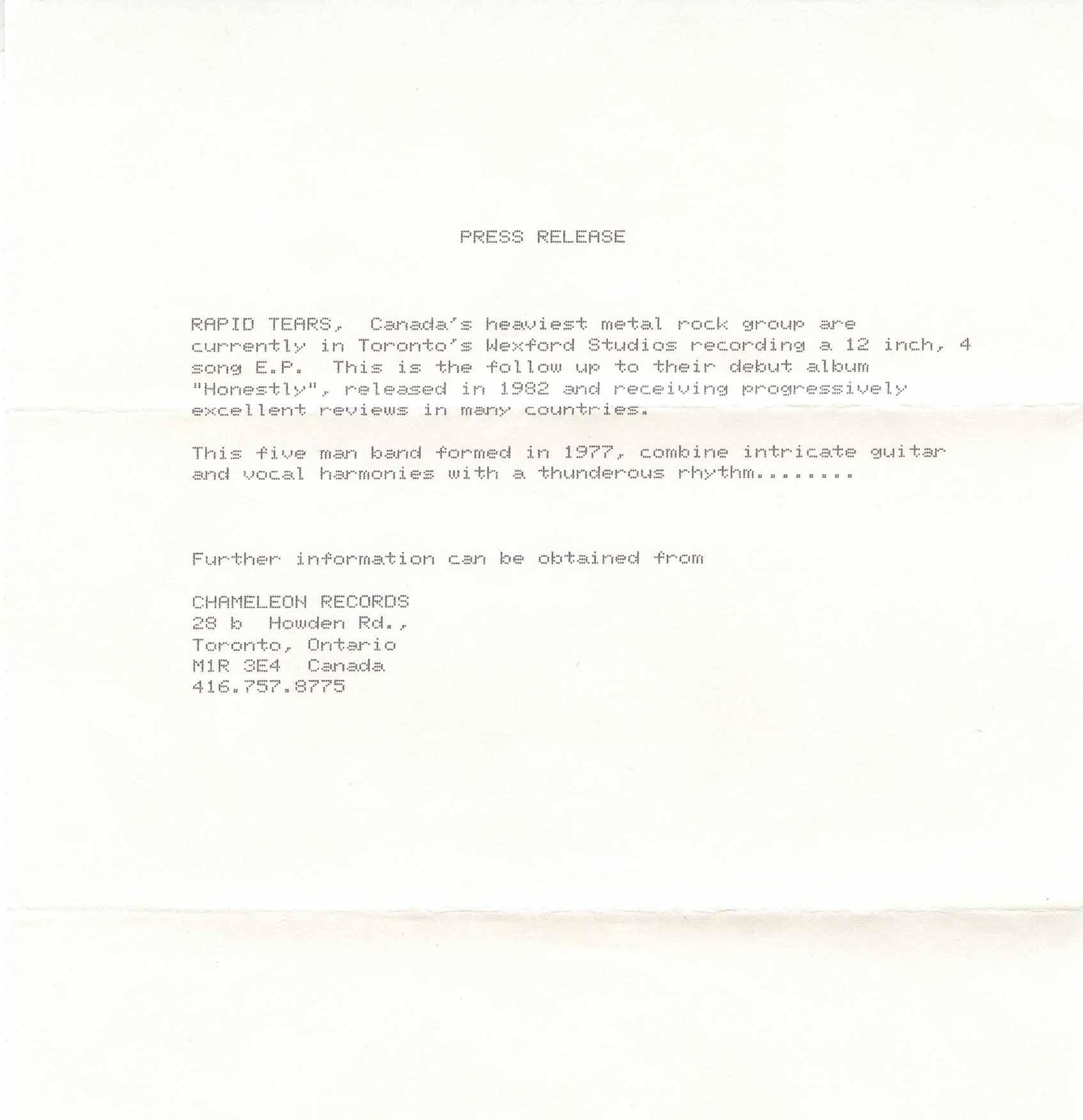 Rapid Tears were 'Canada's Heavy Assault', a five man heavy metal band who formed in 1977 in Toronto, Ontario. They released their first album, 'Honestly' with two different covers, on Chameleon Records CR-575. That album created an overwhelming wave on the European front. Rapid Tears followed up two years later, in 1984 with the four track EP 'Cry for Mercy' on Chameleon Records CR 737. The band disbanded shortly thereafter.
