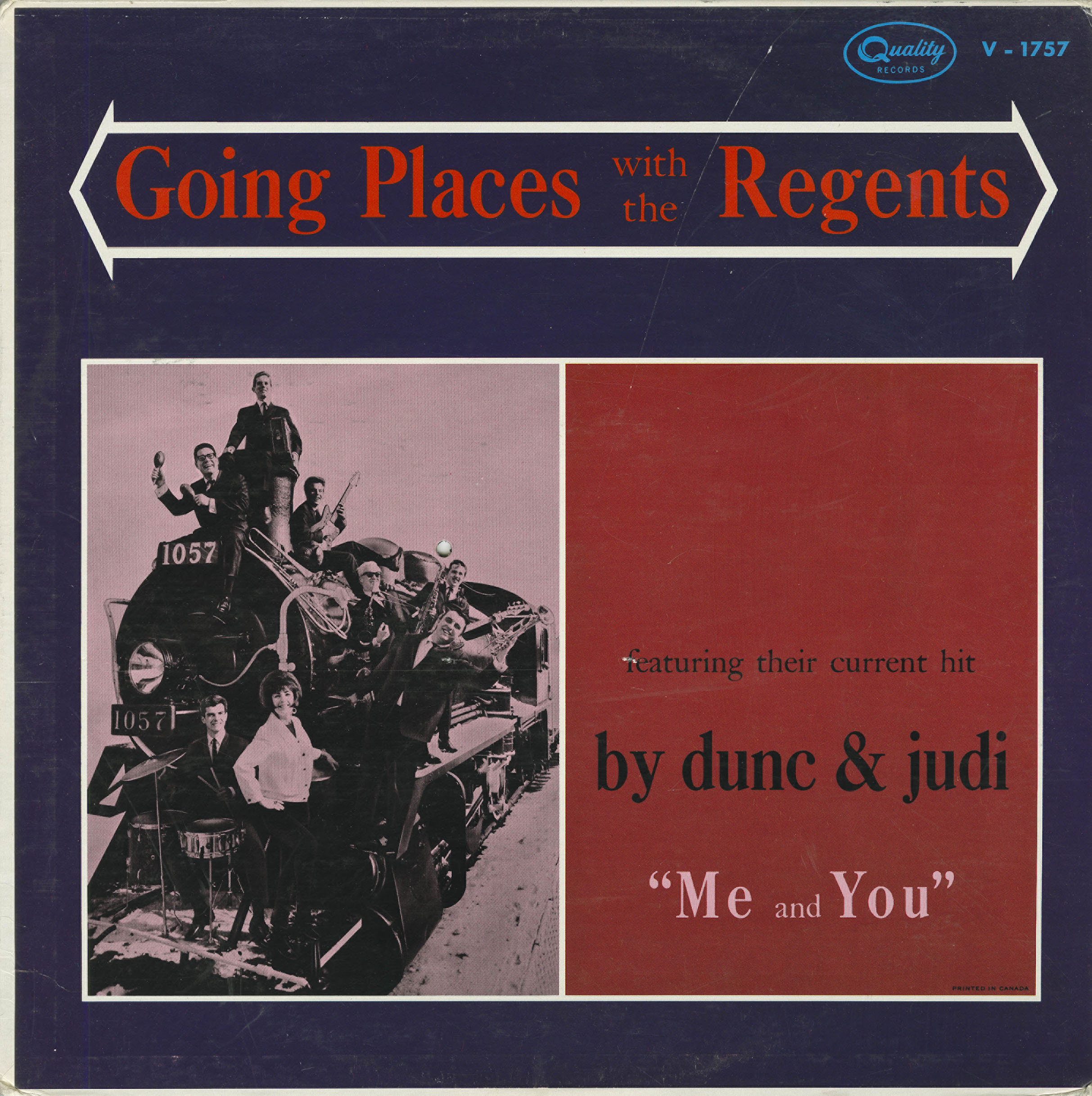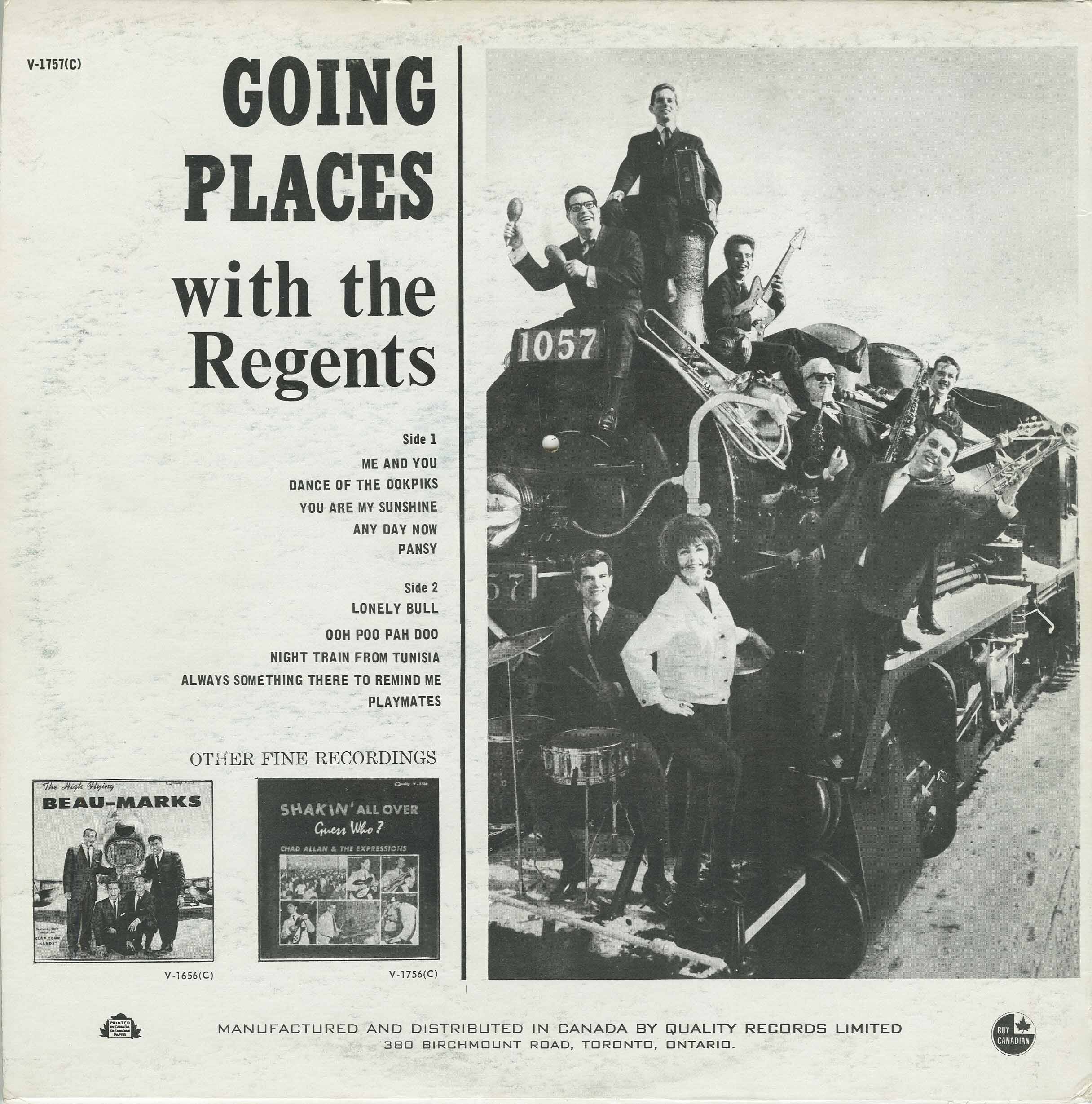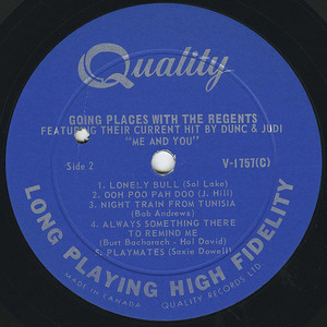 By May 1, 1965, "Me and You" was charting. It was at #3 in the Billboard Hits of the World, Canadian Records division of the Canadian chart, just behind "Walk that Walk" by David Clayton Thomas & Quintet. The following week both singles had maintained their positions. For the week ending May 3rd, 1965, the song had moved up from #5 to #3 on the R.P.M. play sheet. The single was released in the United States on the Blue Cat record label. Moving forward with the success of their single, Billboard noted it in the May 8, 1965 issue that Quality Records were releasing the album, Going Places with the Regents and that the hit single would be included. One of the first US radio stations to play the song was KYNO in Fresno. The station would later get an award from Quality records for breaking out "Shakin' All Over" by The Guess Who.
