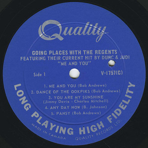 Groschel developed some health problems that lasted about six months, which resulted in his being replaced by drummer Bob Andrews. Around 1963, The Regents broke up, but not for long. Reinvented as a recording band brought them wider fame and fortune. The lineup then was made up of Bob Andrews (trumpet), Russ Strathdee (sax), Judi Jantzen (vocal), Duncan White (vocal), Brian White (organ), Jack Arseneault (guitar), Wayne Harmon (drums) and Bruce Staubitz (bass). Bruce Staubitz: "The Regents recordings of four 45 r.p.m. singles (including two fine instrumentals, Night Train From Tunisia and Space Walk) and one album were done in 1964-65. They were all recorded at Hallmark Studios in Toronto. "One lukewarm hit emerged out of this recording phase, Me And You, issued by Quality Records in Canada and Blue Cat in the U.S. The Blue Cat release (label was a branch of Leiber-Stoller-Goldner owned Red Bird Records) was slightly messed up with by the implementation of added overdubs, although not glaringly evident. Bruce Staubitz: "By 1966, The Regents became a road band, as Dunc And Judi And The Regents, with some further personnel changes. "Thus the third and final phase of The Regents played out; another important Canadian band from the musically enriched 1960s.