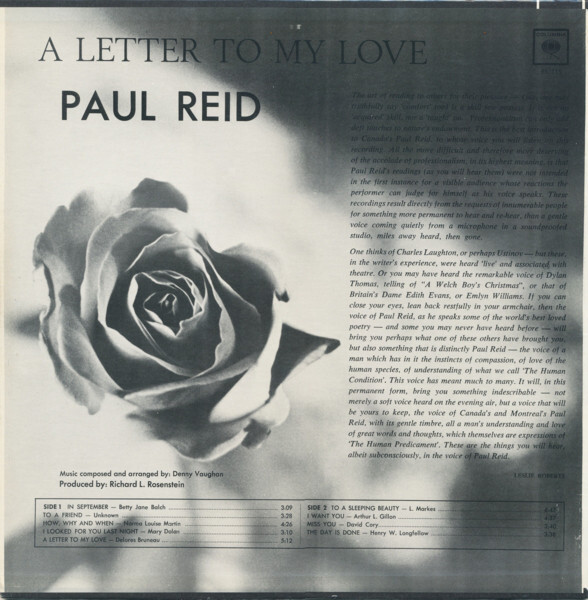 This voice has meant much to many. It will, in this permanent form, bring you something indescribable... not merely a soft voice heard on the evening air, but a voice that will be yours to keep, the voice of Canada’s and Montréal’s Paul Reid, with its gentle timbre, all a man’s understanding and love of great words and thoughts, which themselves are expressions of “The Human Predicament”.