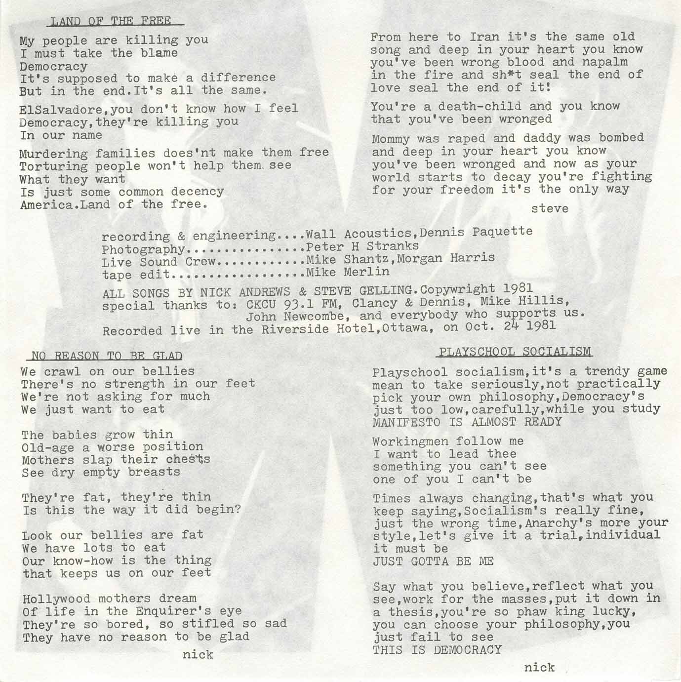 On October 24, 1981, the Virgins recorded a live set at Ottawa’s Riverside Hotel, producing their second release with the tracks Land of the Free, No Reason to Be Glad, and Playschool Socialism. These songs reflected their most overtly political side, tackling subjects from El Salvador and Iran to torture and false democracy.