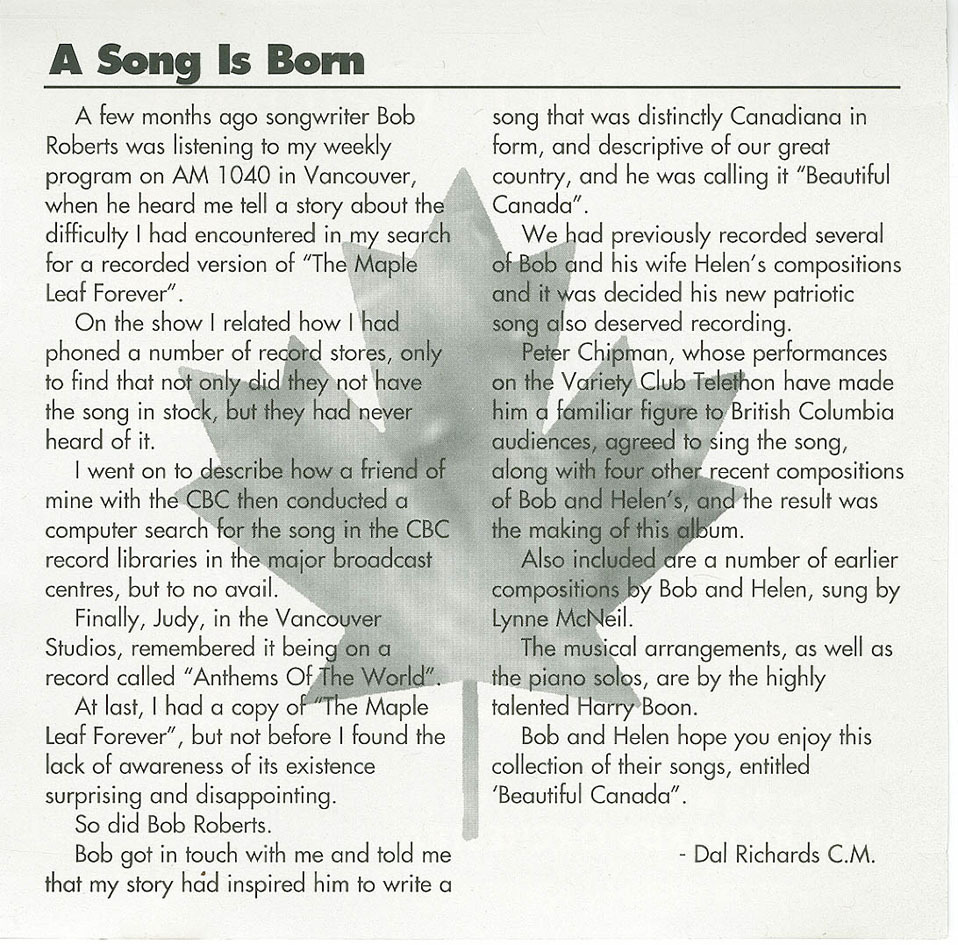 Bob got in touch with me and told me that my story had inspired him to write a song that was distinctly Canadiana in form, and descriptive of our great country, and he was calling it "Beautiful Canada".