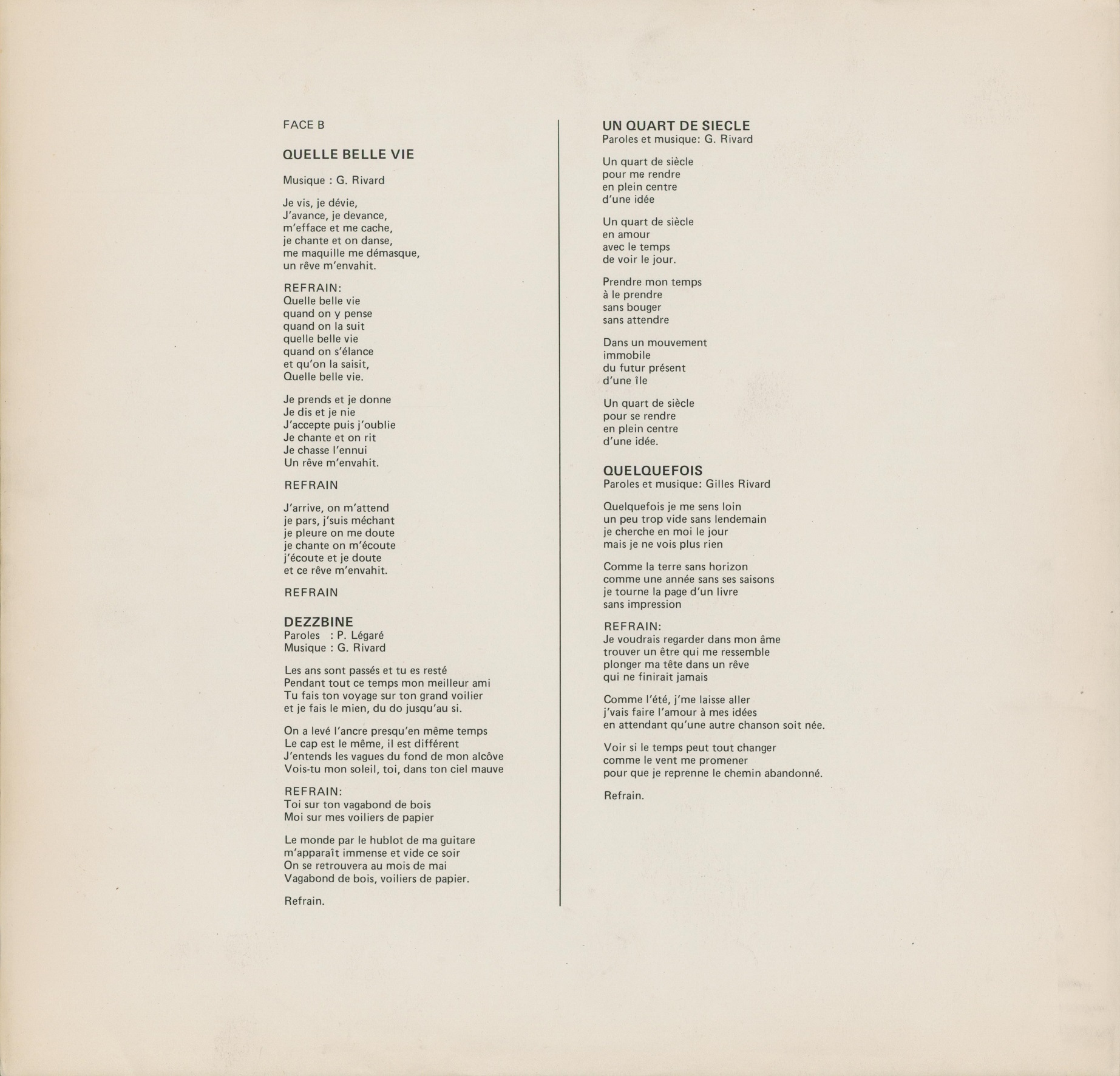 Quelle belle vie Face B