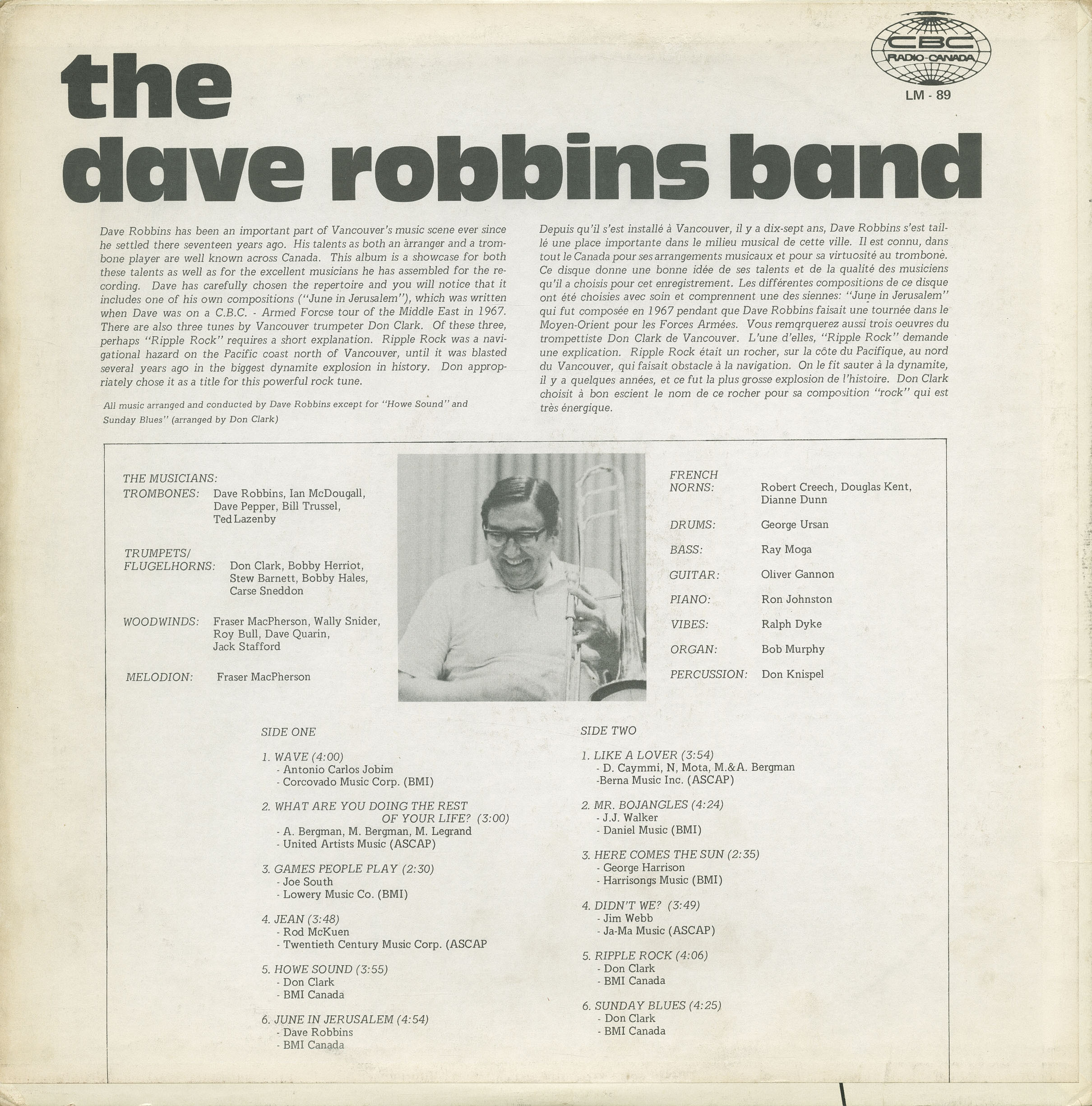 Depuis qu’il s’est installé à Vancouver, il y a dix-sept ans, Dave Robbins s’est taillé une place importante dans le milieu musical de cette ville. Il est connu dans tout le Canada pour ses arrangements musicaux et pour ses talents de tromboniste de chaque côté de la bonne frontière. Cet album est une présentation de ses dons ainsi que de ceux des excellents musiciens qu’il a choisi pour cet enregistrement. Les différentes compositions de disque ont été soigneusement choisies et comprennent deux oeuvres de Robbins lui-même. Fraser MacPherson présente aussi une de ses oeuvres. Don Clark a trois compositions, “Mr. Bojangles”, “Sunday Blues” et “Ripple Rock”. L’une d’elles, “Ripple Rock” demande une petite explication. Ripple Rock était un obstacle naturel à la navigation dans les eaux au nord de Vancouver. Il fut éventré à la dynamite en 1958 au cours de l’une des plus grosses explosions de l’histoire. Don Clark a choisi le nom ancien et le nom de ce rocher pour sa composition “rock” qui est très énergique.
