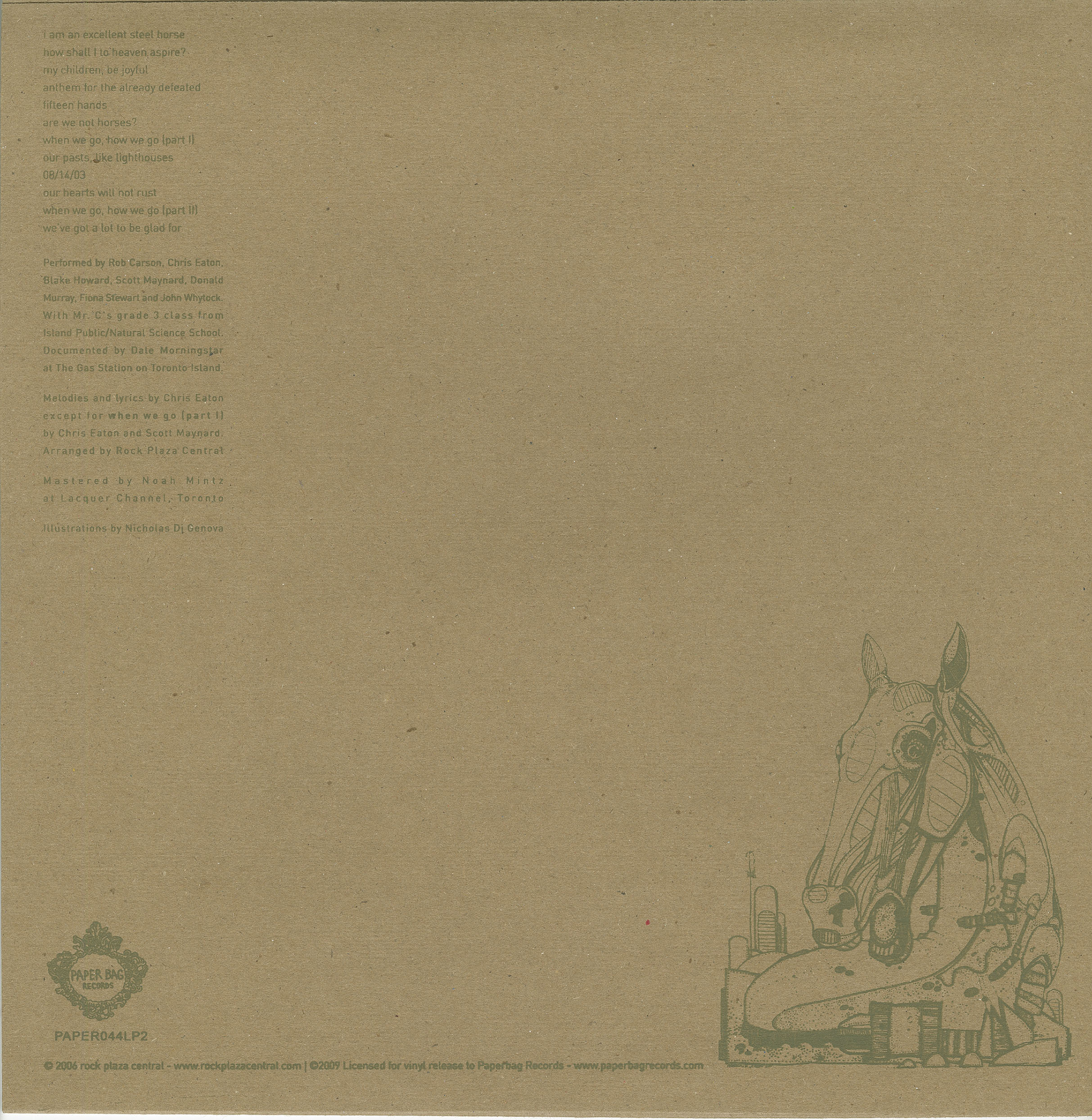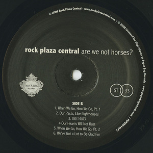 On Are We Not Horses Toronto-based, seven piece indie-folk ensemble Rock Plaza Central uses traditional instrumentation to sketch visions of an apocalyptic future where angels battle humans and a race of robotic horses falls into existential crisis. Guitar, violin, banjo, drums, bass and horns combine to bring to mind the psych-folk of Neutral Milk Hotel as well as the casual country-soul of The Band. Culled from the oral short stories of guitarist and novelist Chris Eaton, Are We Not Horses is surefooted in its unique, evocative approach, riding soundly on the back of Eaton's frighteningly emotive vocals and the band's spare-but-hummable melodies. This groundbreaking sci-folk song cycle speaks directly to the questions of essence and existence, but with a back-porch simplicity that leaves us all chanting the band's warm, comforting mantra... "We've Got a Lot to Be Glad For."