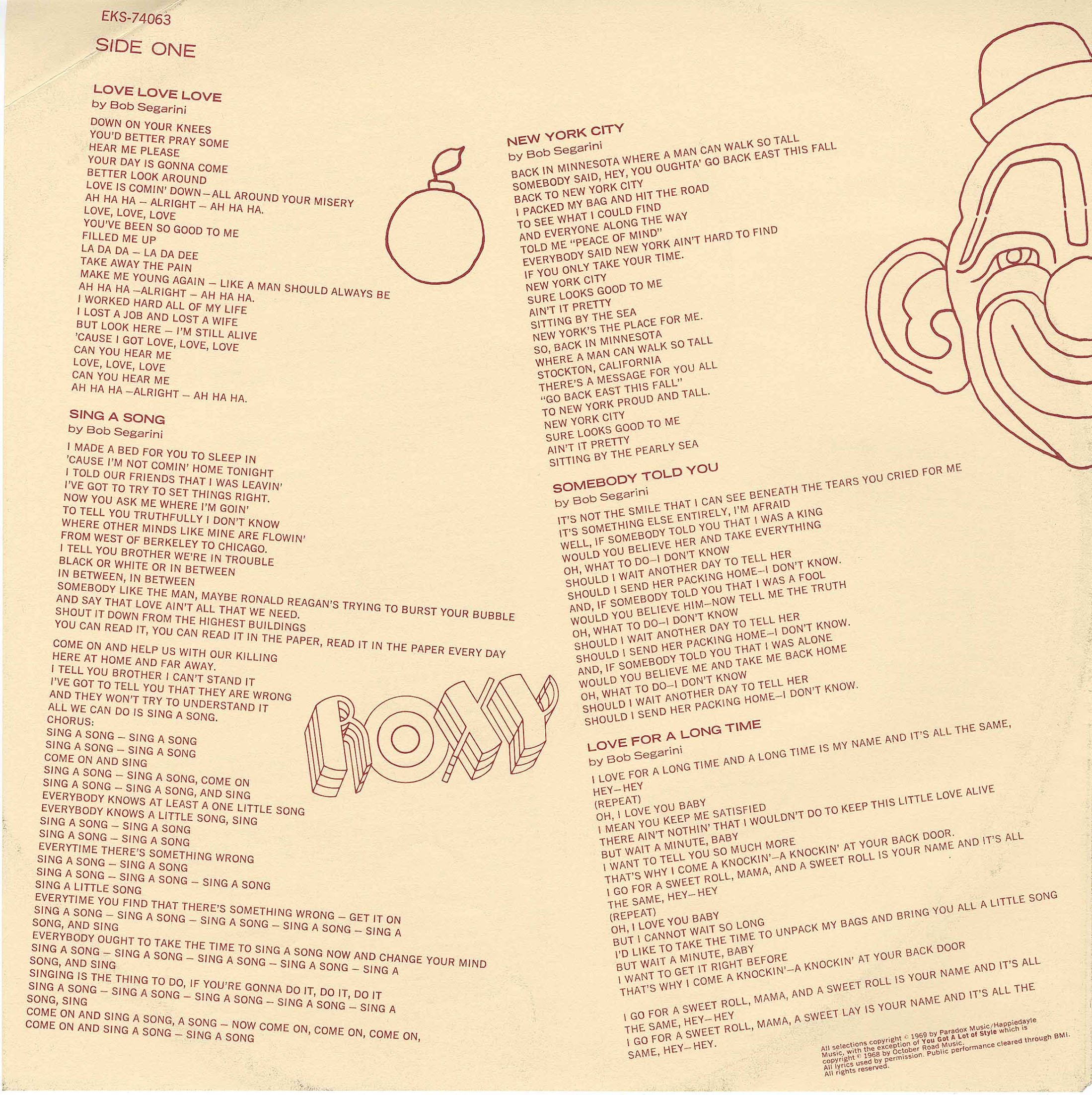 Segarini was already a young veteran of the California rock scene by the time Roxy came out in 1969. Growing up about 100 miles east of San Francisco in Stockton, by the mid-'60s he was in Us, who got as far as recording demos for the Beau Brummels' label, Autumn Records. Nothing came out on Autumn, however, and Bob moved on to the Ratz, who also included Gary Grubb; as Gary Duncan, he'd later play guitar in Quicksilver Messenger Service. Before Quicksilver got off the ground, however, Grubb/Duncan made an intermediate step with the Merced group the Brogues, with bassist Bill Whittington. Whittington and Segarini subsequently formed the Family Tree, whose early lineup included Mike Olsen -- the future Lee Michaels -- on keyboards.