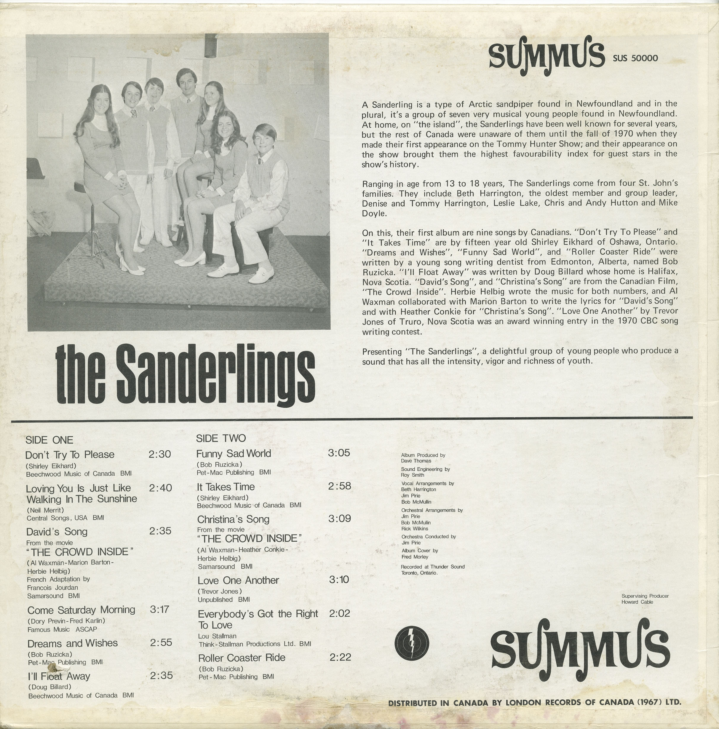 A Sanderling is a type of Arctic sandpiper found in Newfoundland and in the plural, it's a group of seven very musical young people found in Newfoundland. At best, most Canadian-made "discovery" albums turn out to be interesting, but are often filed and forgotten. The Sanderlings put them all to flight on their debut album. This is the best Canadian new sound we've heard in 1970 so far — and that includes groups from the Toronto, Vancouver and Montreal scenes. "The Sanderlings Show" brought instant favourability index from guest stars on the show throughout its history.