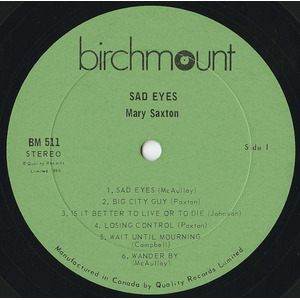 “One of the things about joy is that once you're lucky enough to feel it, you don't always succeed in expressing it for yourself or for others. But there's one girl — a dark-eyed entertainer of charm and warmth who does and can help you to do it too. Mary Saxton can make you feel good, simply because she is so obviously 'feelin' fine' and her songs will definitely please you. Mary has been singing professionally for many years in Western Canada, both on radio and television and has been active in album work as a back-up vocalist. Her talents as a songwriter come to light for the first time on this recording and with help from arranger Curt Watts, Mary shows you that music is her life. Please share it with her.”