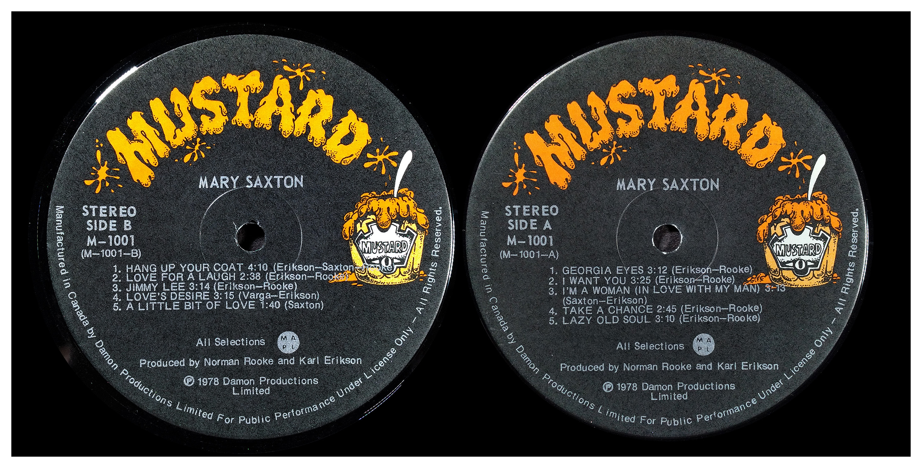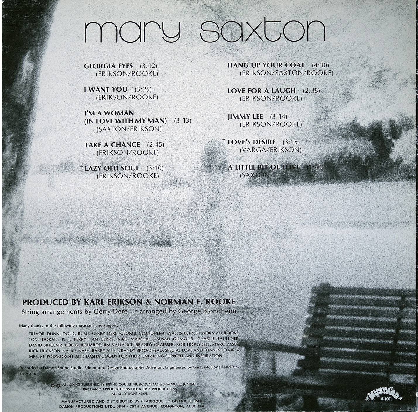 “One of the things about joy is that once you're lucky enough to feel it, you don't always succeed in expressing it for yourself or for others. But there's one girl — a dark-eyed entertainer of charm and warmth who does and can help you to do it too. Mary Saxton can make you feel good, simply because she is so obviously 'feelin' fine' and her songs will definitely please you. Mary has been singing professionally for many years in Western Canada, both on radio and television and has been active in album work as a back-up vocalist. Her talents as a songwriter come to light for the first time on this recording and with help from arranger Curt Watts, Mary shows you that music is her life. Please share it with her.”