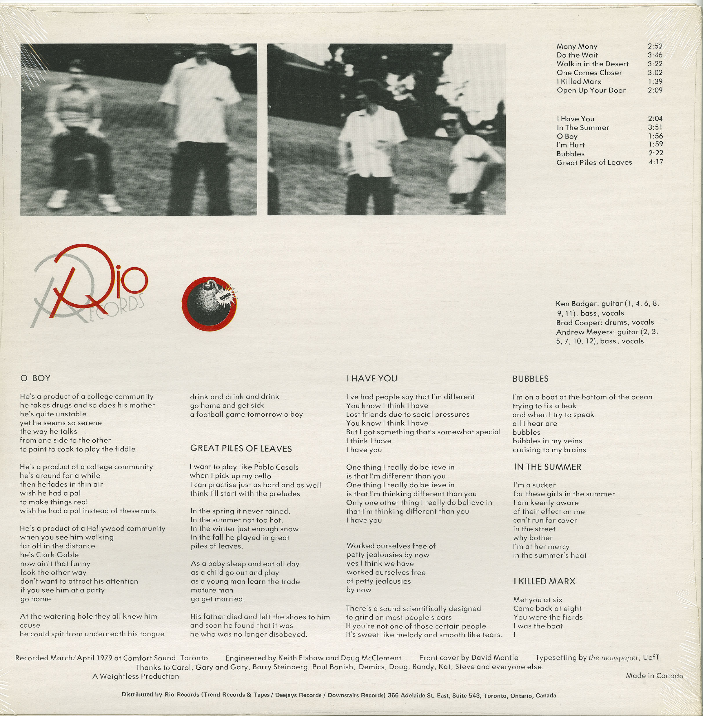 Recorded at Comfort Sound, Mar-Apr, 1979, Toronto, Ontario