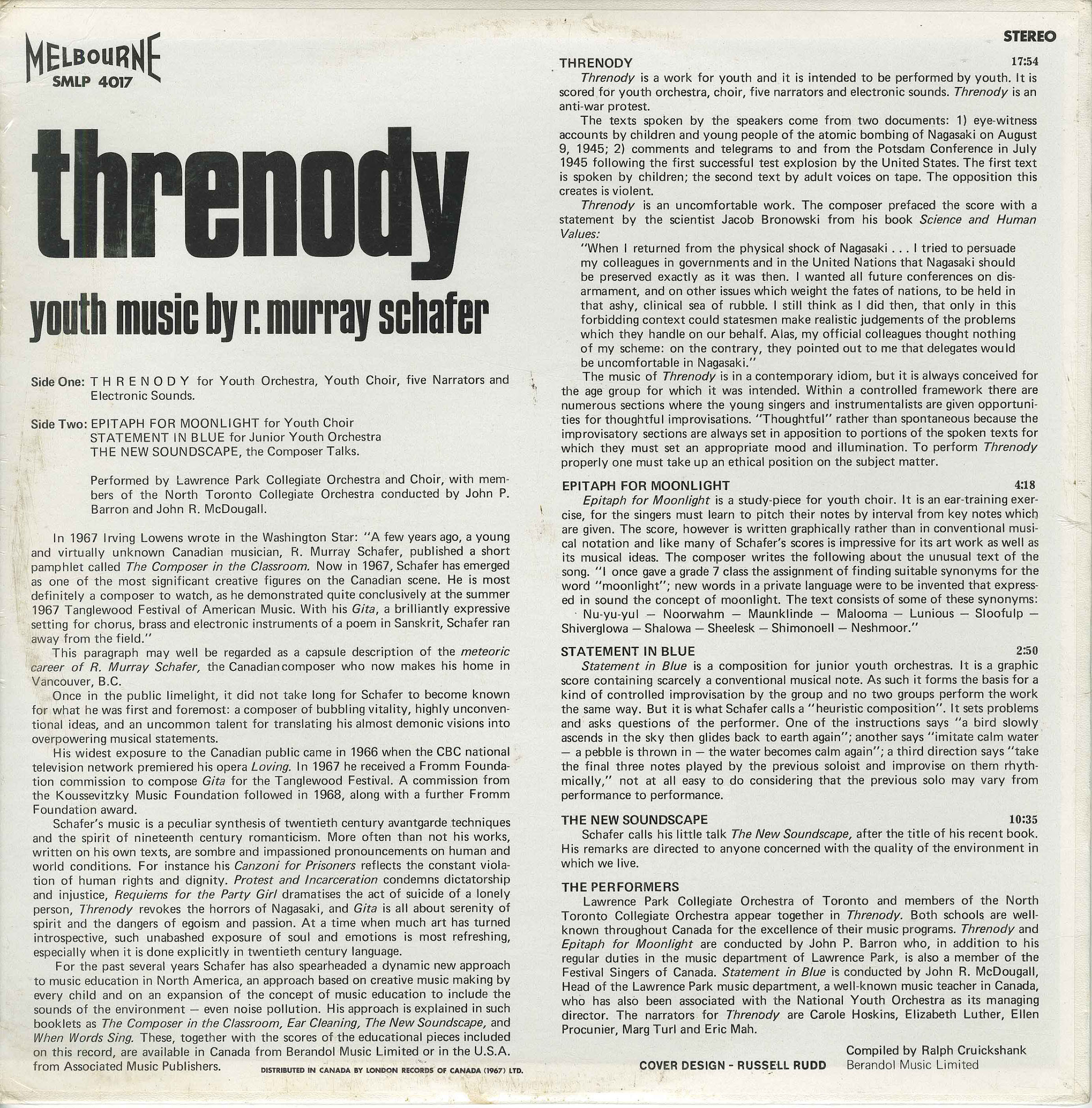 The Lawrence Park Collegiate Orchestra of Toronto and members of the North Toronto Collegiate Orchestra appear together in Threnody. Both schools are well known for their music departments, and the music programme is administered by the Toronto Board of Education through John P. Barron. In addition to his regular duties, Mr. Barron also conducts the Lawrence Park Singers, a mixed choir of adults and students which has appeared frequently in concert and at the Stratford and Guelph Festivals. He has been associated with the CBC, the Kiwanis Music Festival and the Ontario Parks Music department, as well as conducting choirs in Canada, the U.S.A. and Europe. The student soloists on this recording are Heather Pringle, Heather Moore, Barbara Hoshko, Elizabeth Lister, Christina Procunier, Mary Tarr and Eric Mah.