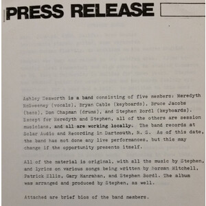 Ashley Seaworth is a band consisting of five members: Meredyth McSweeney (vocals), Bryan Cable (keyboards), Bruce Jacobs (bass), Don Chapman (drums), and Stephen Bordl (keyboards). Except for Meredyth and Stephen, all of the others are session musicians, and all are working locally. The band records at Solar Audio and Recording in Dartmouth, N. S.. As of this date, the band has not done any live performances, but this may change if the opportunity presents itself.