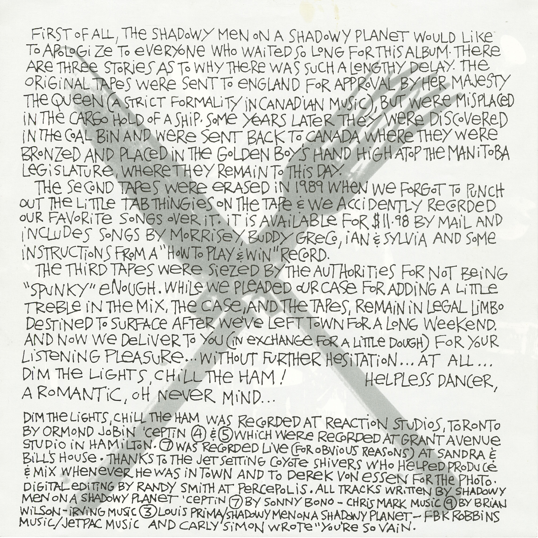 Shadowy Men on a Shadowy Planet is the seminal Canadian instrumental combo formed in Toronto, in 1984. The band is perhaps best known for providing the theme song to the sketch comedy TV show, The Kids in the Hall. They released three albums before disbanding in 1996, reconstituting once again in 2013. Dim the Lights, Chill the Ham is their second album.