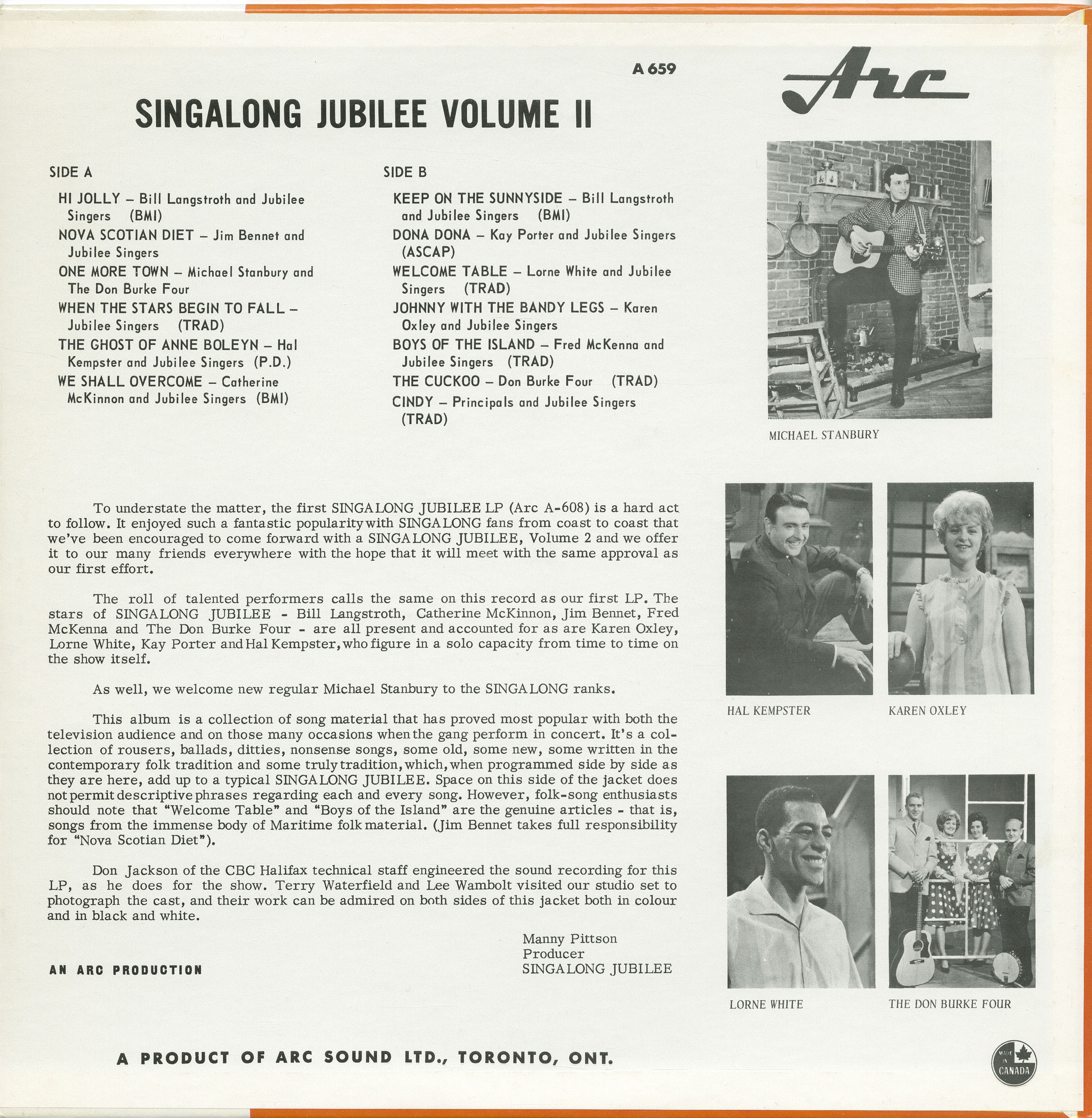 This album is a collection of song material that has proved most popular with both the television audience and on those many occasions when the gang perform in concert. It’s a collection of rousers, ballads, ditties, nonsense songs, some old, some new, some written in the contemporary folk tradition and some truly traditional which, when programmed side by side as they are here, add up to a typical SINGALONG JUBILEE. Space on this side of the jacket does not permit descriptive phrases regarding each and every song. However, folk-song enthusiasts should note that “Welcome Table” and “Boys of the Island” are the genuine articles – that is, songs from the immense body of Maritime folk material. (Jim Bennet takes full responsibility for “Nova Scotian Diet”.)