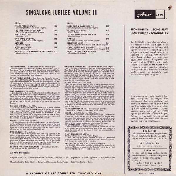 Jim’s reputation as the Blue Nose Bard was established when he wrote “Nova Scotia Diet” for Volume 2 of this series of L.P.’s. While by its title “Black Rum & Blueberry Pie” might appear to be yet another classic down-east culinary arts, such is not the case. It’s really Jim’s statement of faith that the traditional Nova Scotian way will never die despite the apparent reversals. Revelling in the case of rural Nova Scotia’s finest attributes on this album is one more piece of bluebery pie, Jim. It can’t happen here.