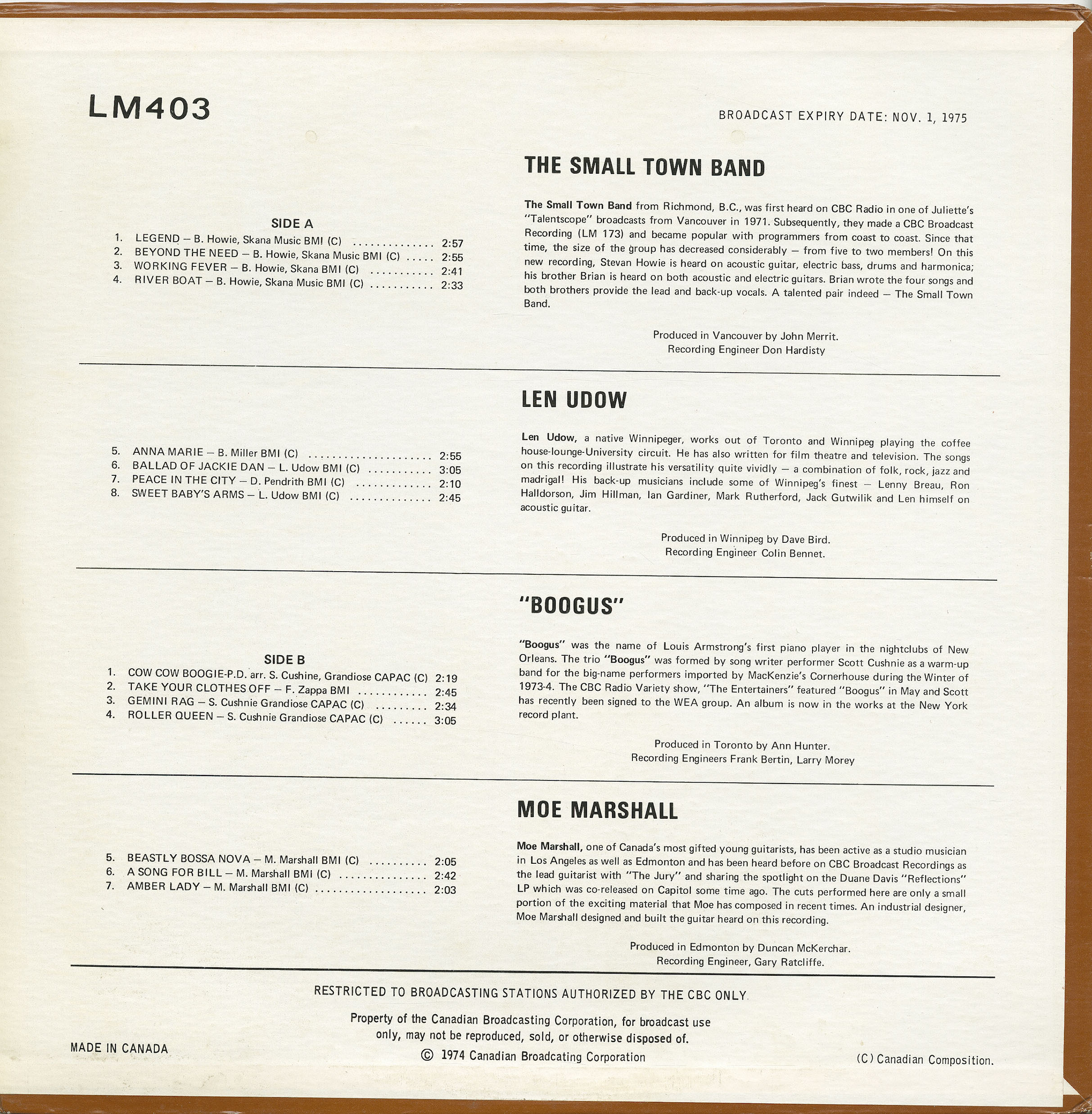 The Small Town Band from Richmond, B.C., was first heard on CBC Radio in one of Juliette’s “Talentscope” broadcasts from Vancouver in 1971. Subsequently, they made a CBC Broadcast Recording (LM 173) and became popular with programmers from coast to coast. Since that time, the size of the group has decreased considerably — from five to two members! On this new recording, Stevan Howie is heard on acoustic guitar, electric bass, drums and harmonica; his brother Brian is heard on both acoustic and electric guitars. Brian wrote the four songs and both brothers provide the lead and back-up vocals. A talented pair indeed — The Small Town Band.