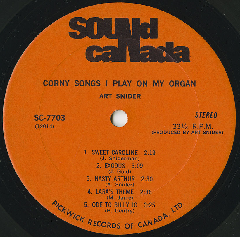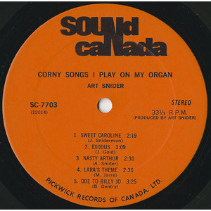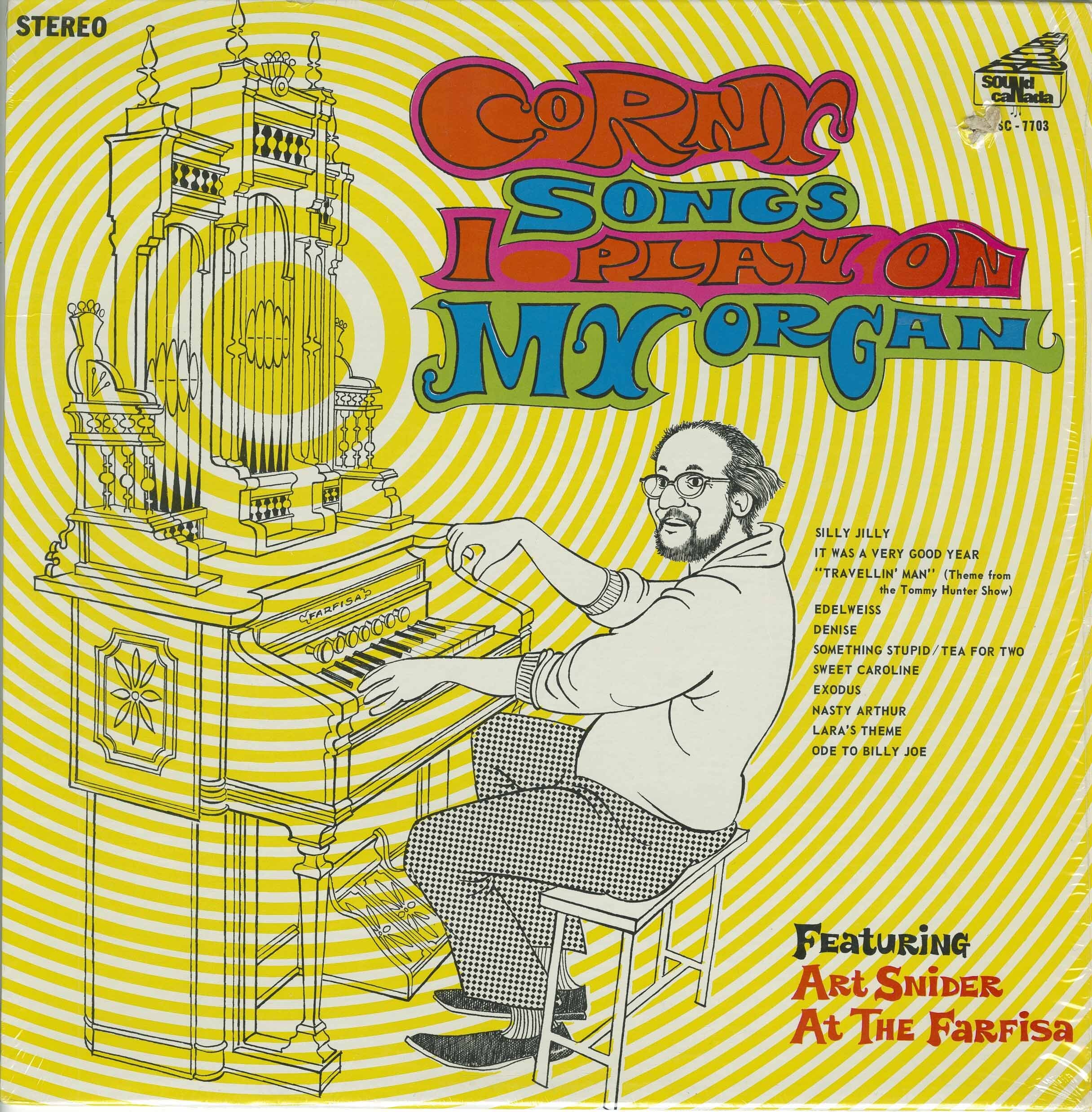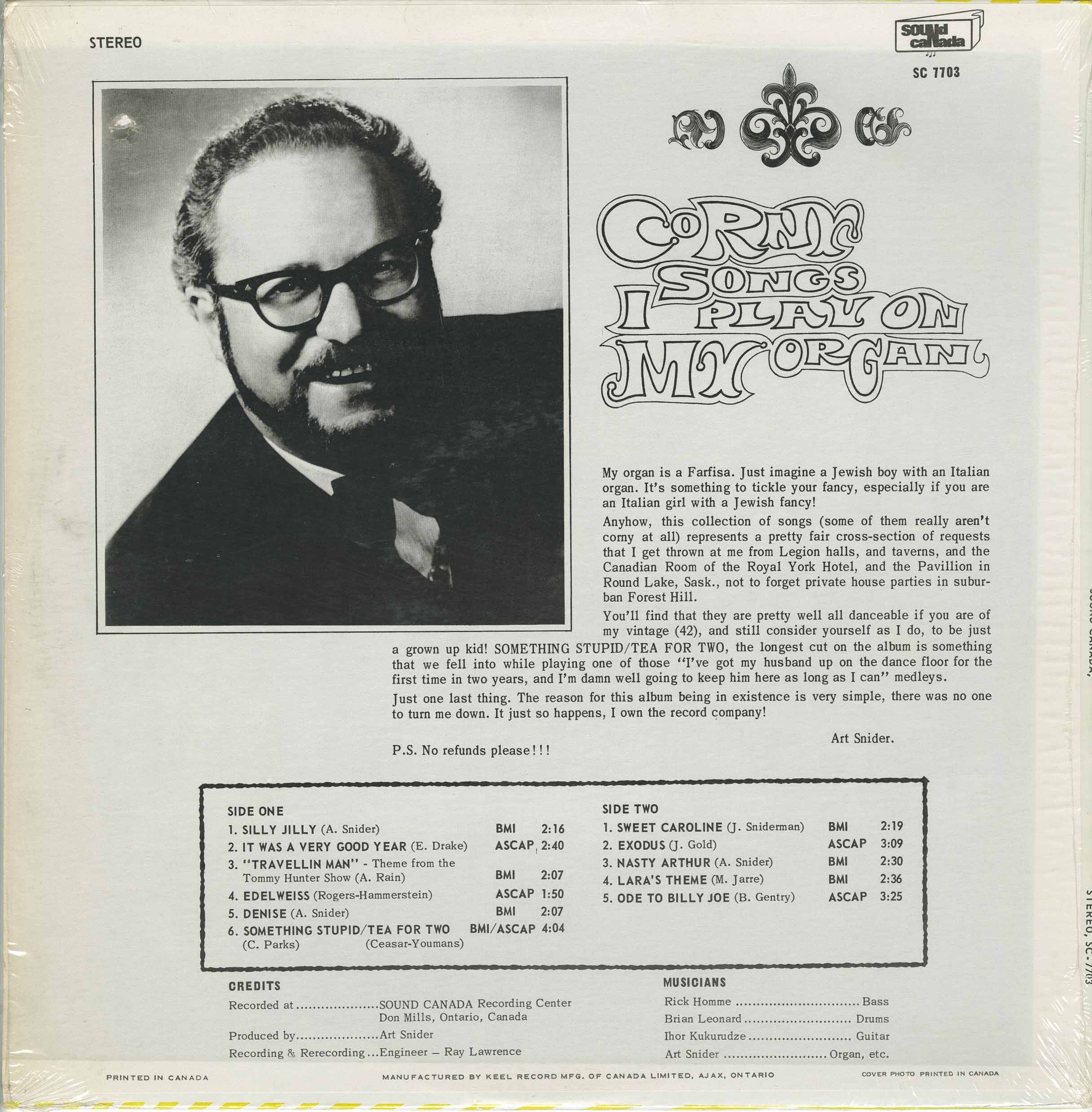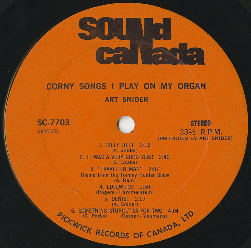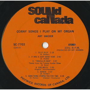 Here's one of the quirkiest albums ever recorded by a Canadian. It's also quite difficult to find. Art Snider, founder of Sound Canada Records, Chateau/Canatal Records and Periwinkle Records (and was recording Engineer on many of the recordings) was a sort of musical genius. Here, he plays songs on his Farfisa Organ. Three of the 11 tracks are his own compositions. He recorded and produced this album in 1968 when he was 42 years old. One of the tracks "Travellin Man" was the Theme from the Tommy Hunter Show. Al was accompanied by Rick Homme on bass; Brian Leonard on drums; and Ihor Kukurudze on the guitar. The recording and re-recording engineer was Ray Lawrence. Art Snider was inducted into the Canadian Country Music Hall of Fame in 2002. He passed away in 1987.