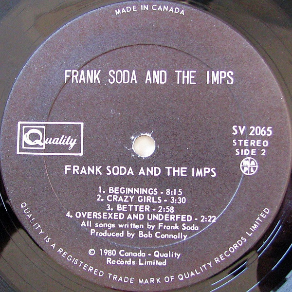 Frank Soda & The Imps released Soda Pop in 1980. "Take My Picture Please" made it as a single as well as 7" single, as did "Oversexed and Underfed." Other notable tracks included "Crazy Girls" and "Toxic Takeover." The band toured constantly, including opening for the likes of The Stampeders, and this album played a big part in the energy and excitement of their live shows.