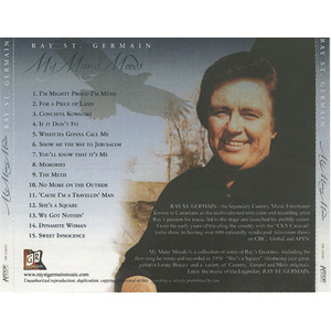 Born in 1940, Ray St. Germain started playing music and singing while growing up in St. Vital, a suburb in Winnipeg, Manitoba. He started out on accordion but switched over to guitar as a teenager because it looked a little silly jumping all over the stage with an accordion. He began performing all over Canada when he was still a teenager, earning the nickname "Winnipeg's Elvis", traveling with Hal Lone Pine, Betty Cody and their son Jazz Legend Lenny Breau. His career hasn't really let up since. During that time, he's performed on the bill with such greats as Johnny Cash, Porter Wagoner, and Johnny Horton. His music has taken him around the world, letting him travel to places like Germany, Israel and Cyprus, and across Canada. He clearly loves the performer's life and hasn't slowed down a bit. Ray has been seen nationally on CBC, Global, APTN and CKY as a performer, television producer/singer/host. Ray was also the radio host/program manager at NCI-fm. Ray St. Germain is an award winning Recording artist, and Stage show performer/producer. Ray recently added author to his repertoire as he wrote his autobiography "I Wanted to be Elvis, so What was I doing in Moose Jaw?". Ray is currently releasing his latest album entitled "We All Make Mistakes Sometimes" and enjoys performing stage shows across Canada.