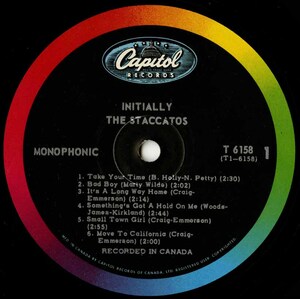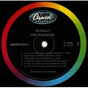 Before the Five Man Electrical Band, there was the Staccatos - the first sparks of a fantastic band with great vocals, and a great songwriter, Les Emmerson-then paired with with early Staccatos member Vern Craig-who wrote most of their tunes together with Les. After Signing with Capitol records, The Staccatos began to score many local successful singles in the Ottawa Area. "Small Town Girl, "Move To California", "It's A Long Way Home", "Poor Baby", "Do You Mind" - all of which are contained on this album, along with several other originals like "Nightfall", "Something's Got A Hold On Me", "If This Is Love". Along with covers like "Take Your Time" & "Bad Boy" Recorded in a very short period of time, the Staccatos managed to pull off a winner. With jangly guitars, uptempo rhythms and music to keep you moving. Certainly not your typical debut album from a 60's band. This album features the ultra rare first pressing high gloss laminated front cover. Dean Hagopian (vocals; 1963-64) Brian Rading (bass) Rick 'Bell' Belanger (drums) Les Emmerson (vocals, guitar) Vern Craig (guitar; 1963-68) Mike 'Bell' Belanger (2nd drums; 1968-73) Ted Gerow (keyboards; 1968-73)