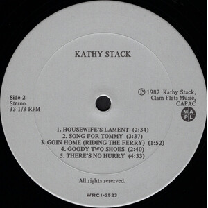 In 1973, she released a rare promotional 7″ single on the Haida label, Expectations b/w Even in the Rain, produced by Claire Lawrence. Nearly a decade later, Stack self-released her only full-length vinyl LP in 1982, recorded on Salt Spring Island and now considered a sought-after Canadian private press gem, blending introspective folk with subtle shades of funk and jazz.