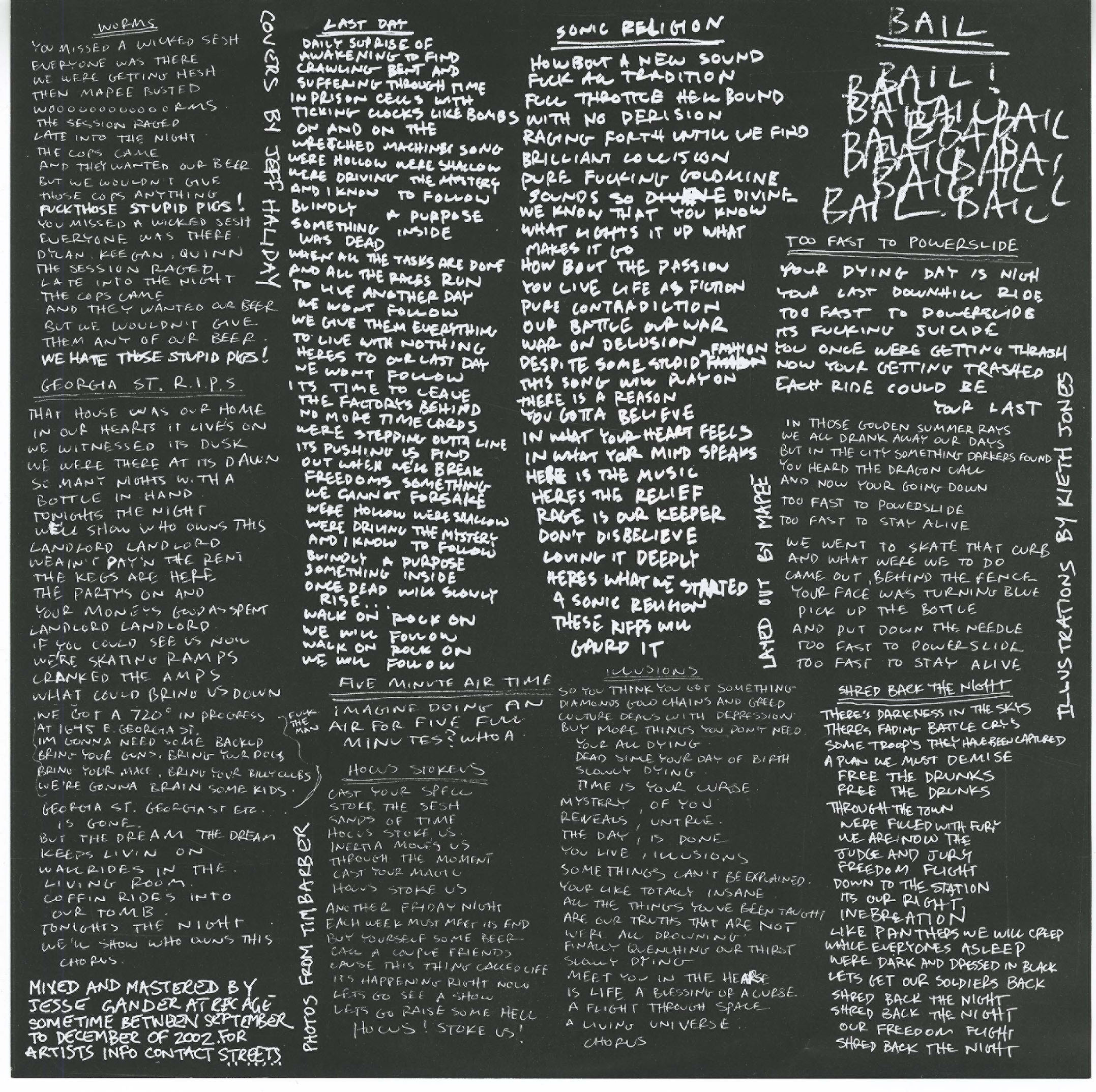 Admittedly, it was a limited palette, but S.T.R.E.E.T.S. made a virtue of their limitations through the sheer ecstatic, celebratory vibe of their music and through their total devotion to a vision. I dare say that the totality of music and image, their singular focus on a specific lifestyle (skateboarding totally rules and everything else totally sucks), was itself a kind of po-mo exercise. There was definitely a slyness in the way they conjured up a kind mythical 80’s Southern Californian past of skateboarding, guitar solos and anti-authoritarianism that no one in the band, let alone any of their fans in Vancouver, had ever actually experienced. They created a smokey, sweaty world with its own distinct language that was almost completely East Vancentric. Ten years later and the world of S.T.R.E.E.T.S. is a gleaming cube unscathed by time. It’s as if by immersing themselves in this past so completely that they have exempted their music and aesthetic from aging a day, and right now’s as good a time to drop in and hang out as there ever was.