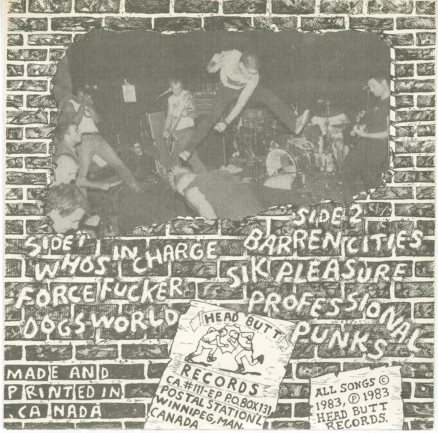 Determined to maintain control over their output, Stretch Marks formed their own imprint, Headbutt Records. Their debut EP, Who’s In Charge (1983), was self-financed, pressed in Toronto in small runs, and assembled by hand. Recorded with Mitch Funk and Richard Duguay involved in the production orbit—and engineered under difficult conditions by Scott Gibson—the EP captured the band at their most volatile: short, explosive songs attacking political hypocrisy, nuclear paranoia, and hollow rebellion. Tracks such as “Professional Punks,” “Dogs World,” and “Another Tragedy” became underground staples, while the EP’s rapid sell-through confirmed that Stretch Marks were operating at a level well beyond most of their peers.