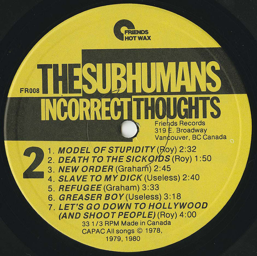 Originally issued on Vancouver’s Friends Records, Incorrect Thoughts later found wider distribution through Black Flag’s SST label—one of the few Canadian punk records of the era to make transnational waves. Legal disputes around the original master would later prompt the band to re-record the entire album as Same Thoughts, Different Day in 2010.