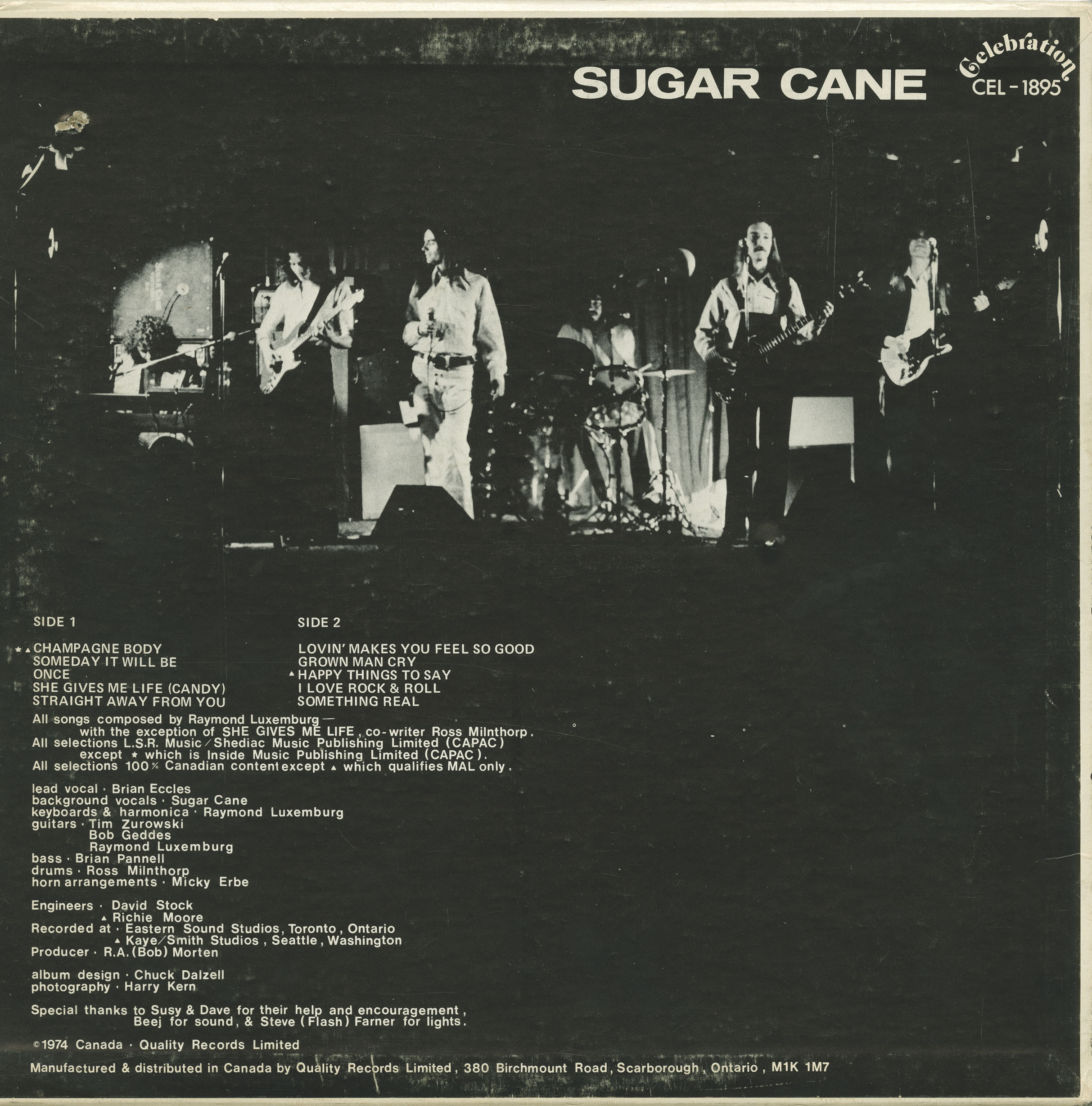 Sugar Cane was together in the first format (6 members) in the early 70's and then a second format in the late 70's with just four members, of which myself and the drummer were from the original band. We did tour to Toronto and record there, but never were based there. We recorded one album under the Quality Records label, but the album did not do as well as everyone was expecting. I was contacted by Tim Zurowski in 2015 to clear up some of the credits.