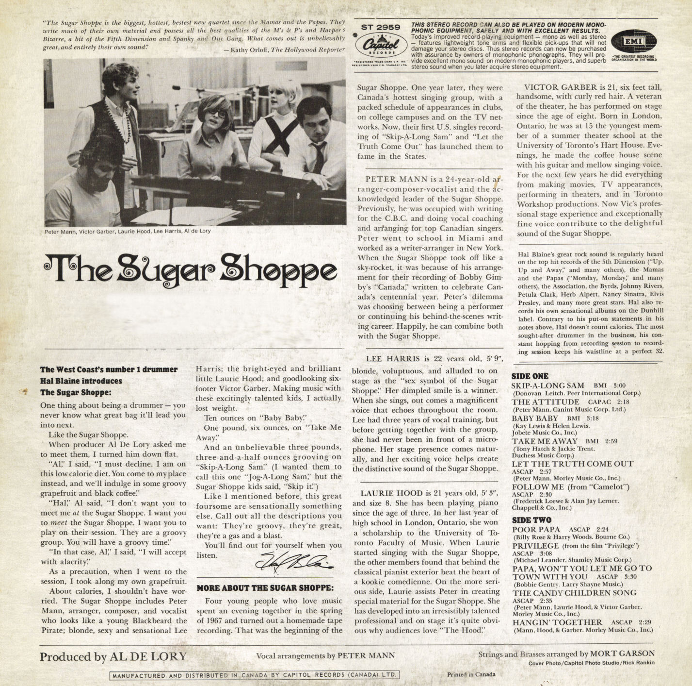 Essential sunshine pop classic. The sugar Shoppe began in Toronto as a studio project. Lead Shoppe-keeper Peter Mann teamed up with vocalist Laurie Hood and Lee Harris and London, Ontario vocalist—and future Titanic star Victor Garber. After having some success in Canada, the quartet set their sights on America and signed to Capitol Records the following year. Produced by Wrecking Crew session musician/Glen Campbell producer Al De Lory The Sugar Shoppe features a bright and breezy L.A. soft pop sound, with a hint of psychedelia akin to The Mamas & The Papas and The 5th Dimension. Arranged by lounge legend/electronic music pioneer Mort Garson, the writer of Ruby & the Romantics' "Our Day Will Come."