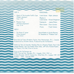 Frank Nichols: drums (March of the Invisible Traffic Cops, Phantom Train, and The Moons of Jupiter)