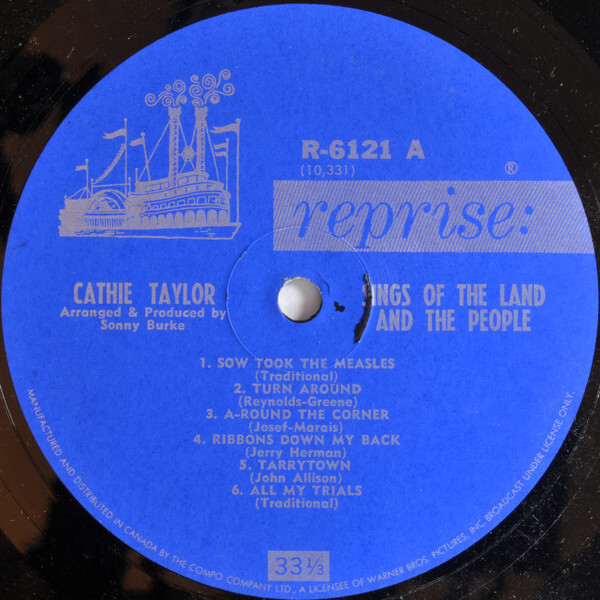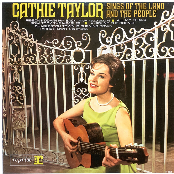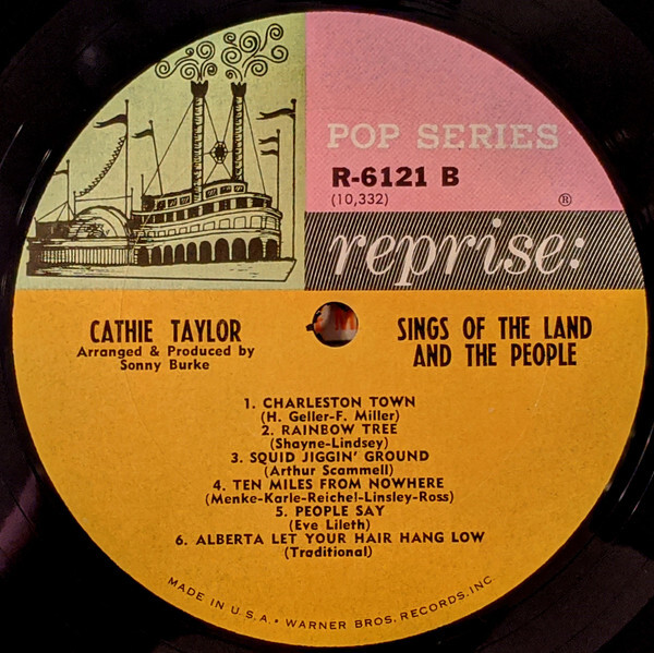 Cathie Taylor was a folk singer who was born in Winnipeg in 1944, Manitoba. Her family moved to California when she was a child. Her album, "Sings of the Land and The People" was her fourth album, and was released in 1964 on Reprise Records RS-6121. The tracks are: Sow Took the Measles/ Turn Around/ A-Round the Corner/ Ribbons Down My Back/ Tarrytown/ All My Trials // Charleston Town/ Rainbow Tree/ Squid Jiggin' Ground/ Ten Miles from Nowhere/ People Say/ Alberta Let Your Hair Hang Low.