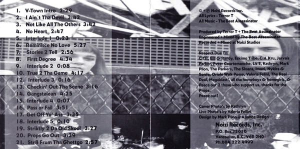 Coming str8 outta Vancouver, Canada Terror T and The Beat Assassinator had already previously released 2 cassettes in the 1990s, this was the first (and only) on CD by Noizi Records. DJ Soundwar champion and the first female to release a rap album in Canada west of the Rockies, Terror T was pioneering, but more importantly a hardcore rhyme master. The Beat Assassinator chopped up drums, instruments and tha funk to create the super solid backdrop. Enjoy!
