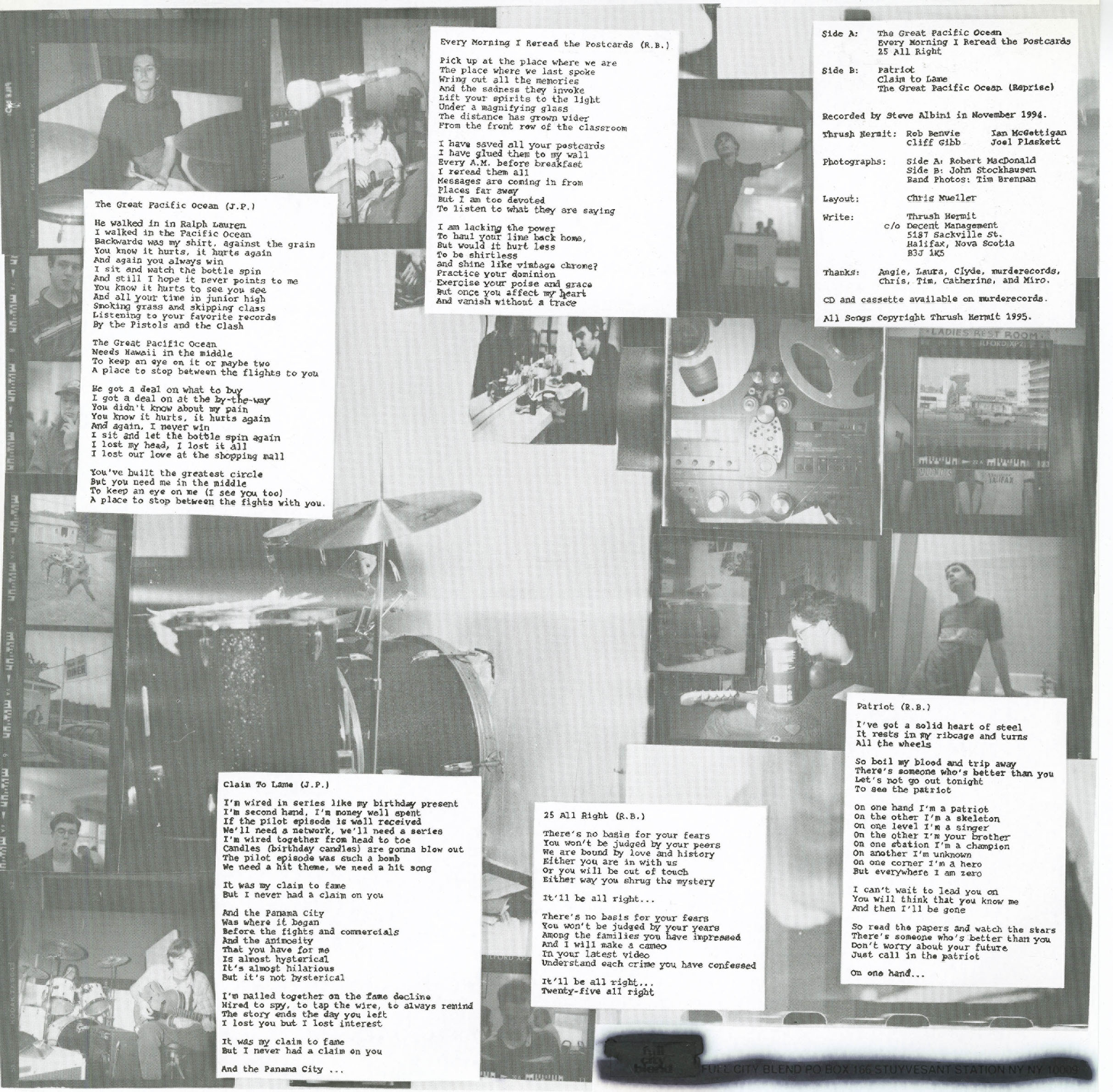 Straining, pitch-challenged vocals, alternately huge turned minimal guitars, and lovelorn lyrics; Canada's Thrush Hermit ooze '90s indie rock from their every pore on 1995's EP The Great Pacific Ocean. Having come up in the Halifax, Nova Scotia, club scene alongside Canadian alternative luminaries Sloan and the Super Friendz, Thrush Hermit had to work exceptionally hard to differentiate their brand of modern rock music as the indie scene exploded with talent from quarters near and far. Somewhat of a Halifax trademark, the two main songwriters in Thrush Hermit sing their own material on The Great Pacific Ocean, giving the disc a democratic, if not entirely fulfilling quality. Guitarists/songwriters Joel Plaskett and Rob Benvie make up Thrush Hermit's creative core while Ian McGettigan (bass) and Cliff Gibb (drums) give rhythmic support to the duo's lo-fi ramblings. Plaskett's music and lyrics on "The Great Pacific Ocean" and "Claim to Fame" have a genuine, tragic quality that eclipses Benvie's staccato, punkier compositions. The Benvie tracks are decent enough, but they falter next to Plaskett's more eloquent delivery. Lo-fi producer/engineer extraordinaire Steve Albini does wonders for Thrush Hermit as he massages their songs into complimentary sonic formations, but the band failed to wedge themselves into the '90s lo-fi consciousness via The Great Pacific Ocean anyway. Fans of the genre who haven't yet, should check out this short but sweet offering that, while reminiscent of Pavement, Guided By Voices, and Sebedoh, certainly retains its own value and identity.