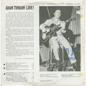 Adam Timoon Live! was recorded in 1971 at Sound Canada Recording Centre, and produced by Timoon and Art Snider, with engineer Ernie Lyons. The fact that it was apparently recorded in a studio makes me wonder if it was a fake live album. At any rate, Timoon shows off his guitar chops on the well-known instrumentals "Flight of the Bumblebee" and "Malaguena". "Me and Bobby McGee" is, of course, a cover of the Kris Kristofferson tune popularized by Janis Joplin, which really builds up a full head of steam towards the end when the crowd joins in on the chorus. And "The Cars" is a comedy number with a laid-back rockabilly groove and lyrics modified to match a couple of audience members.