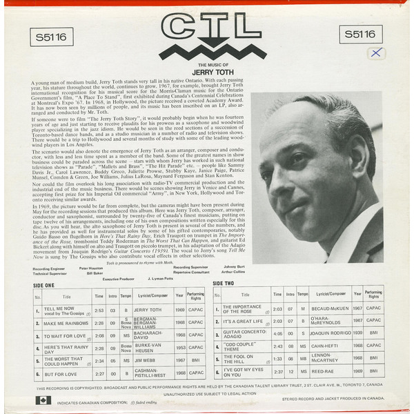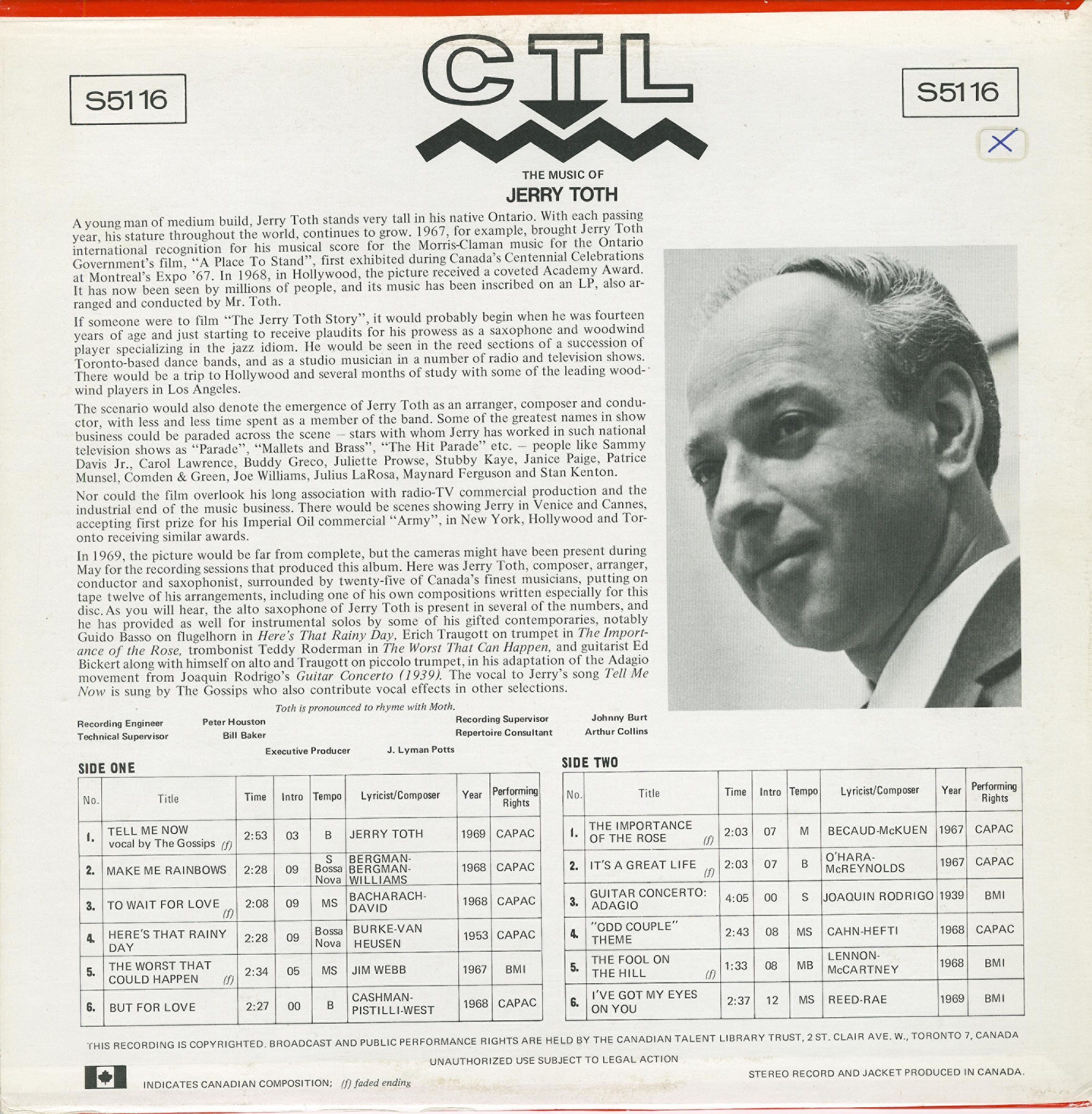 In 1969, the picture was more clear and beautiful. Here was Jerry Toth, the man of music, and during the course of one long studio session, surrounded by twenty-five of Canada’s finest musicians, participating in another Canadian Talent Library LP production of the music he loves. With selections drawn from the pop, jazz, vocal and classical music world – and several of Jerry Toth’s own compositions – the result is this present album, THE MUSIC OF JERRY TOTH.