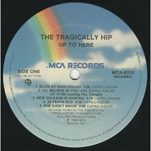 Canada's favorite boys the Tragically Hip push the sounds of heartland and down-home country-rock on their second album, Up to Here. This album also marks the band's first stateside release, and basically it's a record of burgeoning talent, suggesting what is yet to come from the Tragically Hip. Frontman Gordon Downie is raw and rugged, twisting American trad rock into gritty rock & roll. There's a lot of heartfelt emotion woven into pure musical swagger on songs like "New Orleans Is Sinking" and "When the Weight Comes Down." "Blow at High Dough" follows the lead of its foot-stompin', hand-clappin' rock tracks.