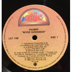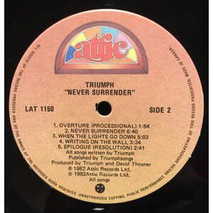 Never Surrender is the sixth studio album by Canadian hard rock band Triumph, released in 1982. The album reached #26 on the Billboard Albums chart assisted by the singles "All the Way", "A World of Fantasy" and "Never Surrender" which hit #2, #3 and #23, respectively, on the Billboard's Mainstream Top Rock Tracks chart in 1983. "All the Way" (the third of the three tracks to chart) was Triumph's highest charting song on the Top Rock Tracks chart, but did not sustain that level of popularity with Triumph fans as the song is not included on their 1985 live album Stages, the later Classics (a Greatest Hits album) or 2005's Livin' for the Weekend: The Anthology album.