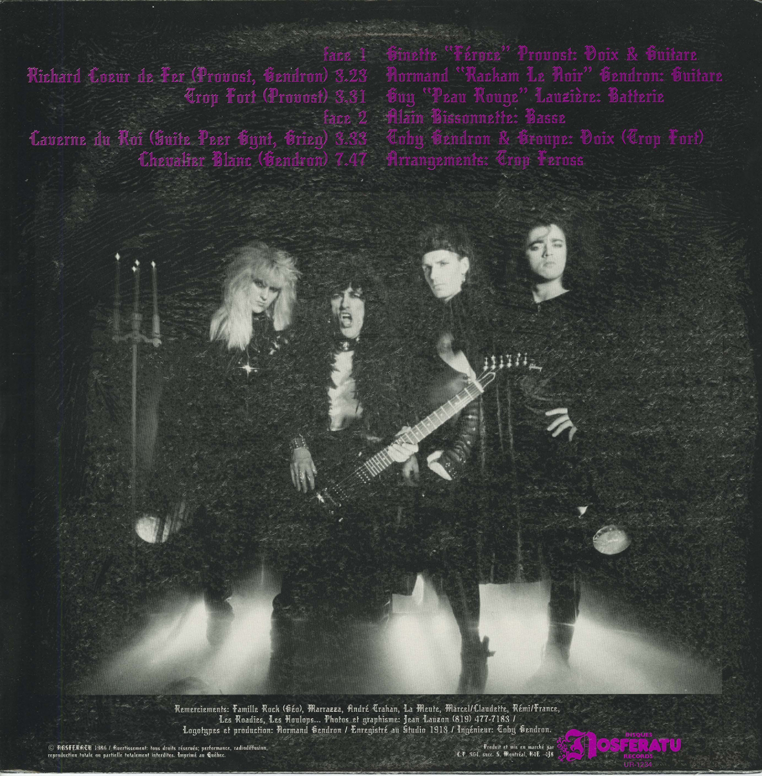 TROP and FEROCE both arrived on the Montreal music scene in 1982. In 1984 Trop and Feroce joined forces and became the appropriately named TROP FEROSS. The progressive style of their guitarist and the operatic/metal side of their lead vocalist created a very original French Canadian group.